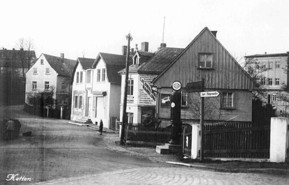 Nejrozšířenější typ meziválečné čerpací stanice, stacionární stojan, v tomto případě v Chotyni na Liberecku. Soukromá sbírka.