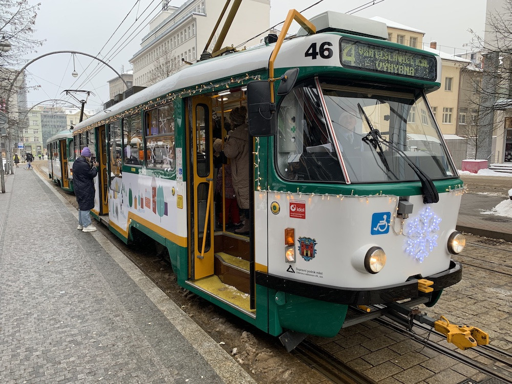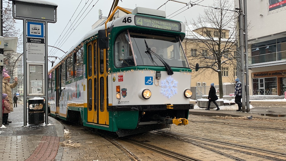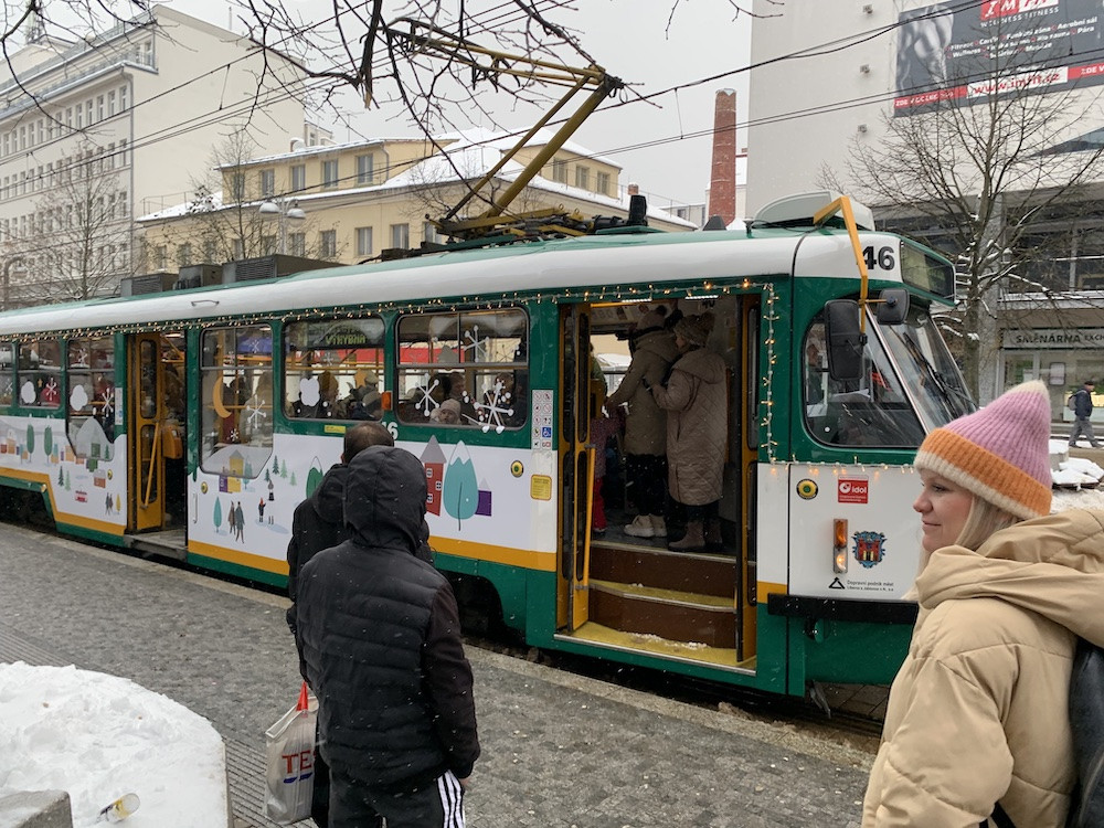 Adventní tramvaj projela zasněženým Libercem. Uvnitř lidé zpívali koledy