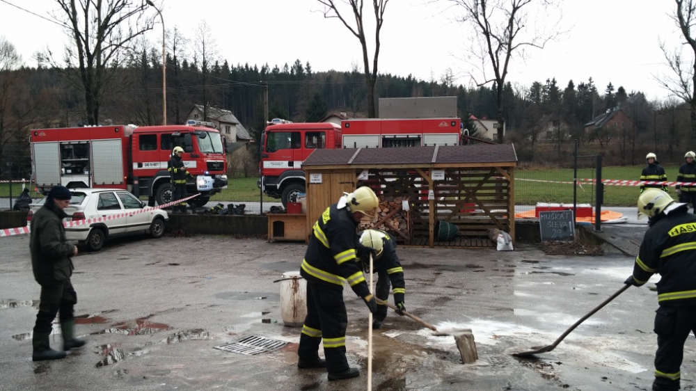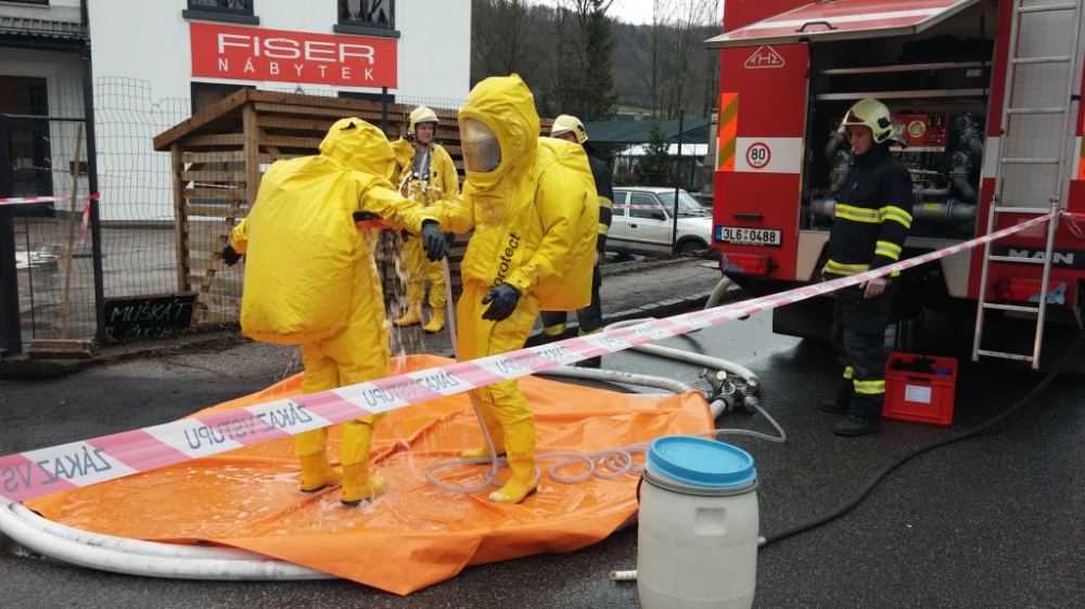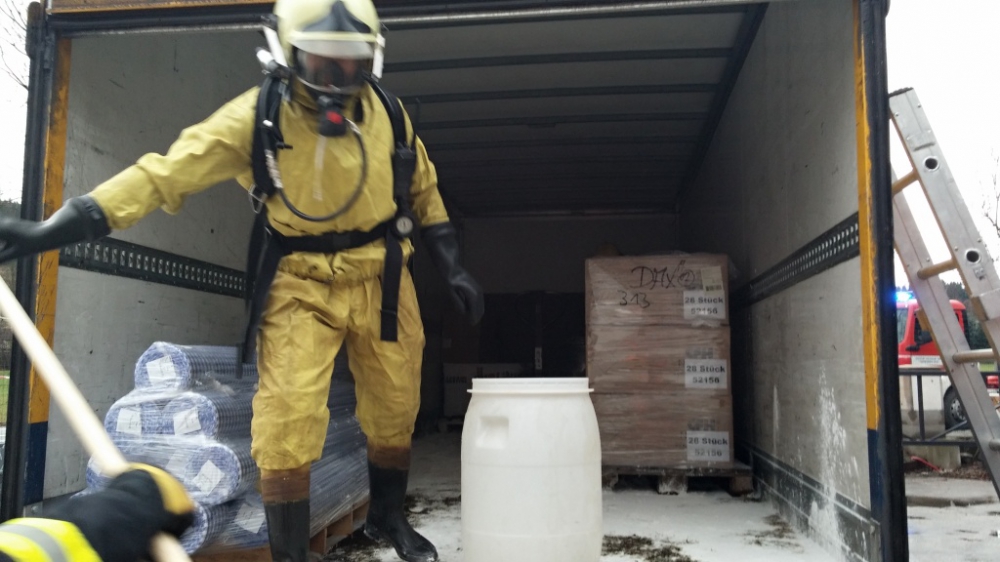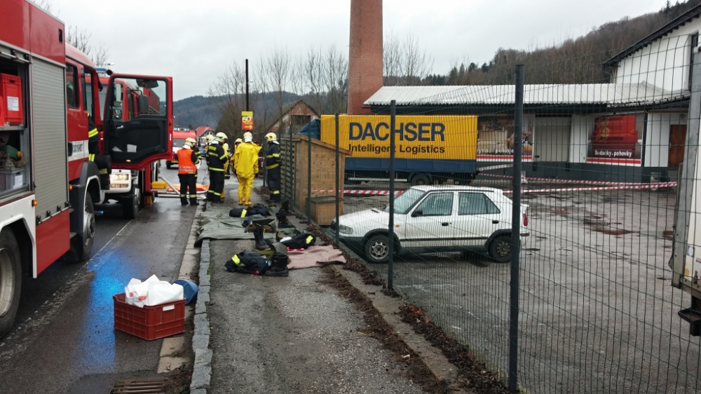 Z korby nákladního automobilu unikla kyselina dusičná. Foto: HZSLK
