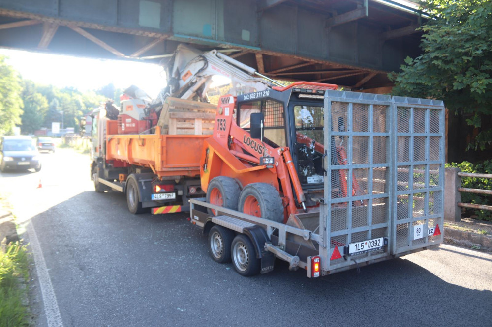 Nákladní auto převážející bagr uvízlo pod železničním mostem. Na hodinu se zastavil provoz na železnici