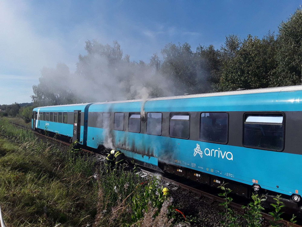 Požár vlaku u Zákup. Hasiči ze soupravy evakuovali desítky lidí