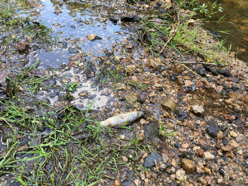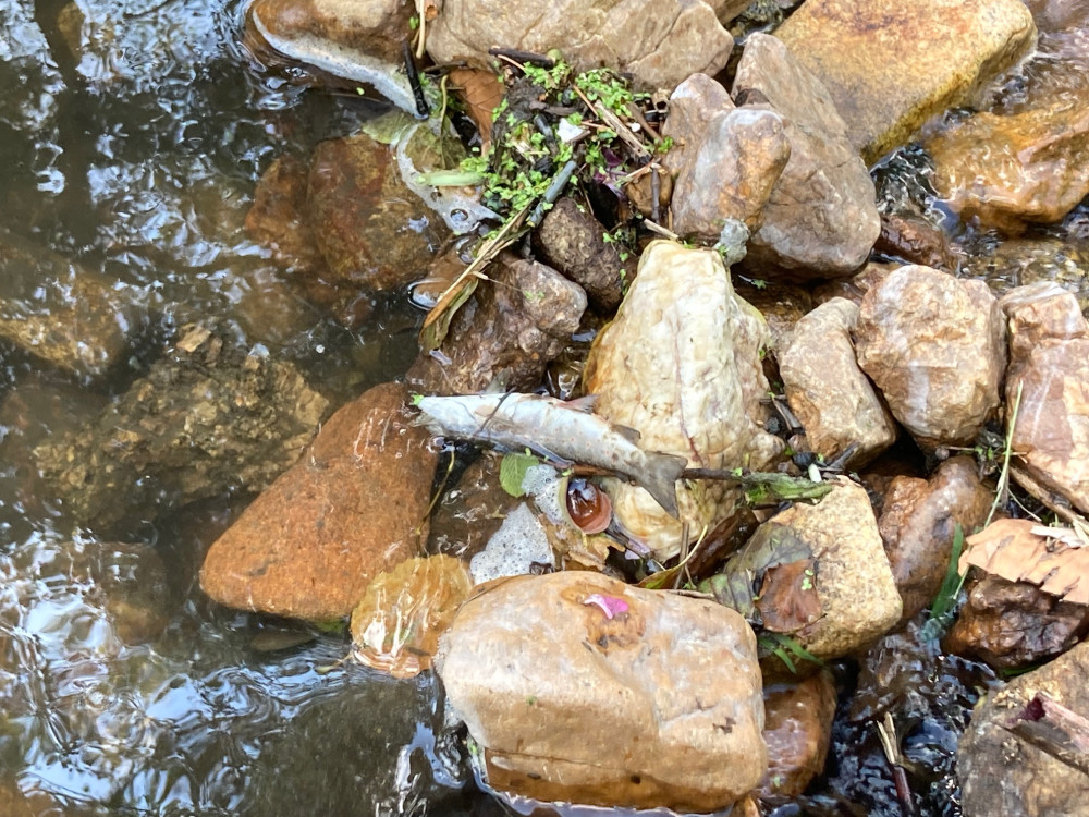 Mrtvé ryby v Harcovském potoce na přehradě.