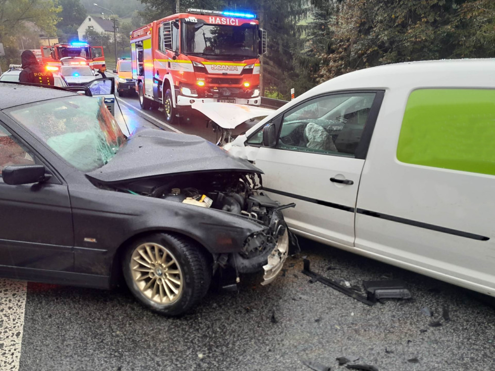Srážka auta s dodávkou. Nehoda uzavřela silnici v Mníšku, tři zranění