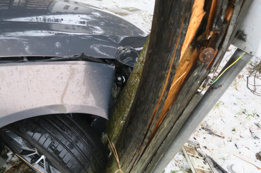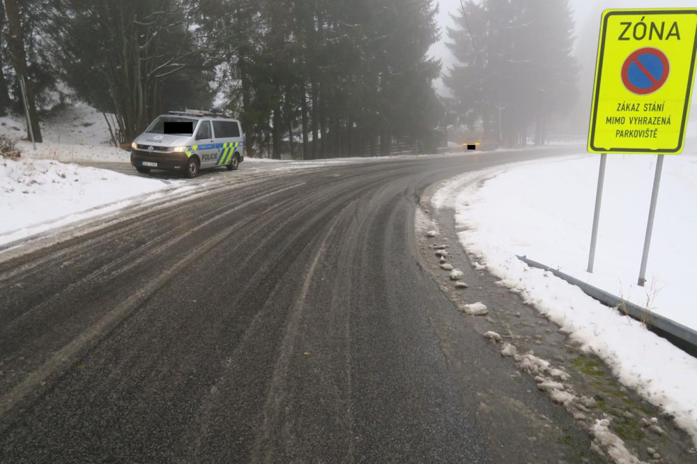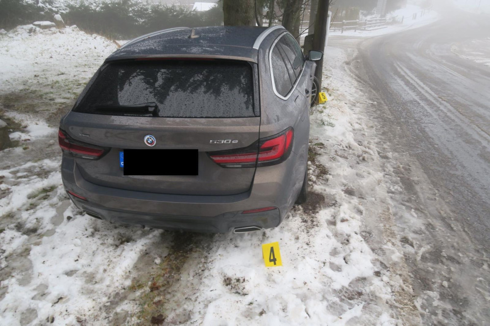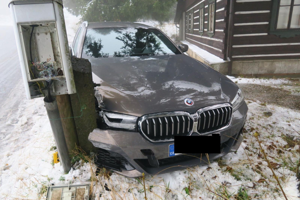 Řidič na sněhu v Bedřichově nezvládl jízdu, narazil do sloupu