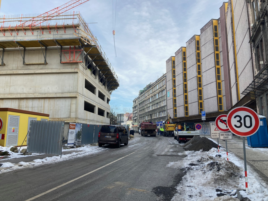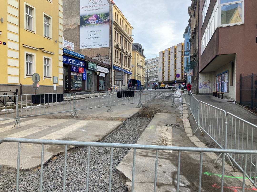 Jablonecká ulice zůstane zavřená až do konce roku 2026, otevře se jen na příští zimu. Vjezd pro sanity a do parkovacího domu bude zajištěn
