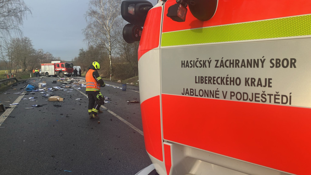 Střet dodávky s nákladním autem se uzavřel silnici 13 u Jablonného, jeden člověk zemřel