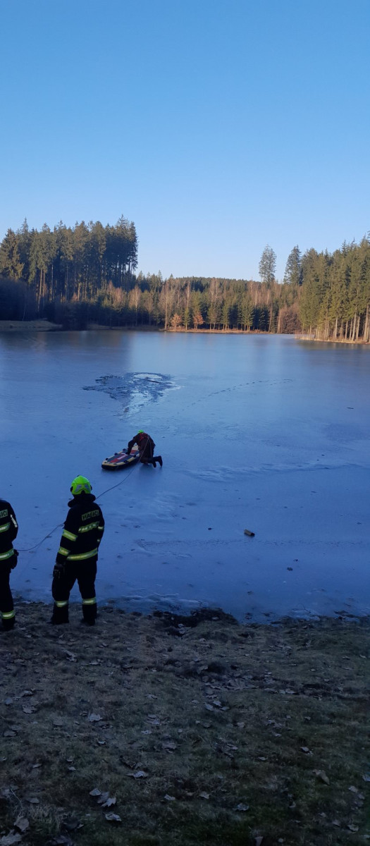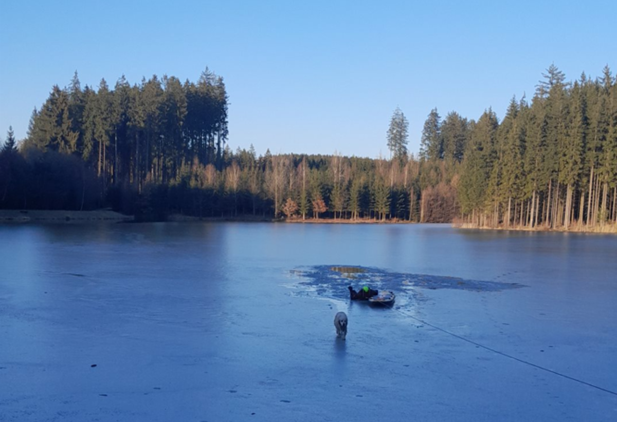 Jedenáctiletá fenka uvízla v Horní Branné v díře v ledu na rozmrzajícím rybníce. Na břeh ji hasiči dostali pomocí paddleboardu