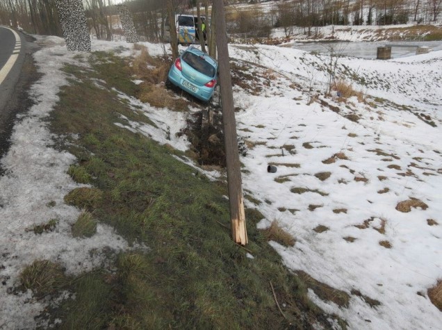 Řidič přerazil u Mníšku telefonní sloup, vyvázl bez zranění. Foto: Policie ČR
