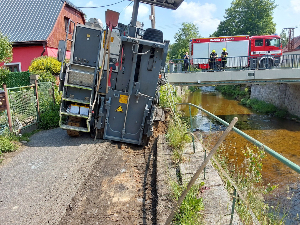 Hasiči v Hejnicích vyprošťovali silniční frézu. Hrozil její pád do řeky