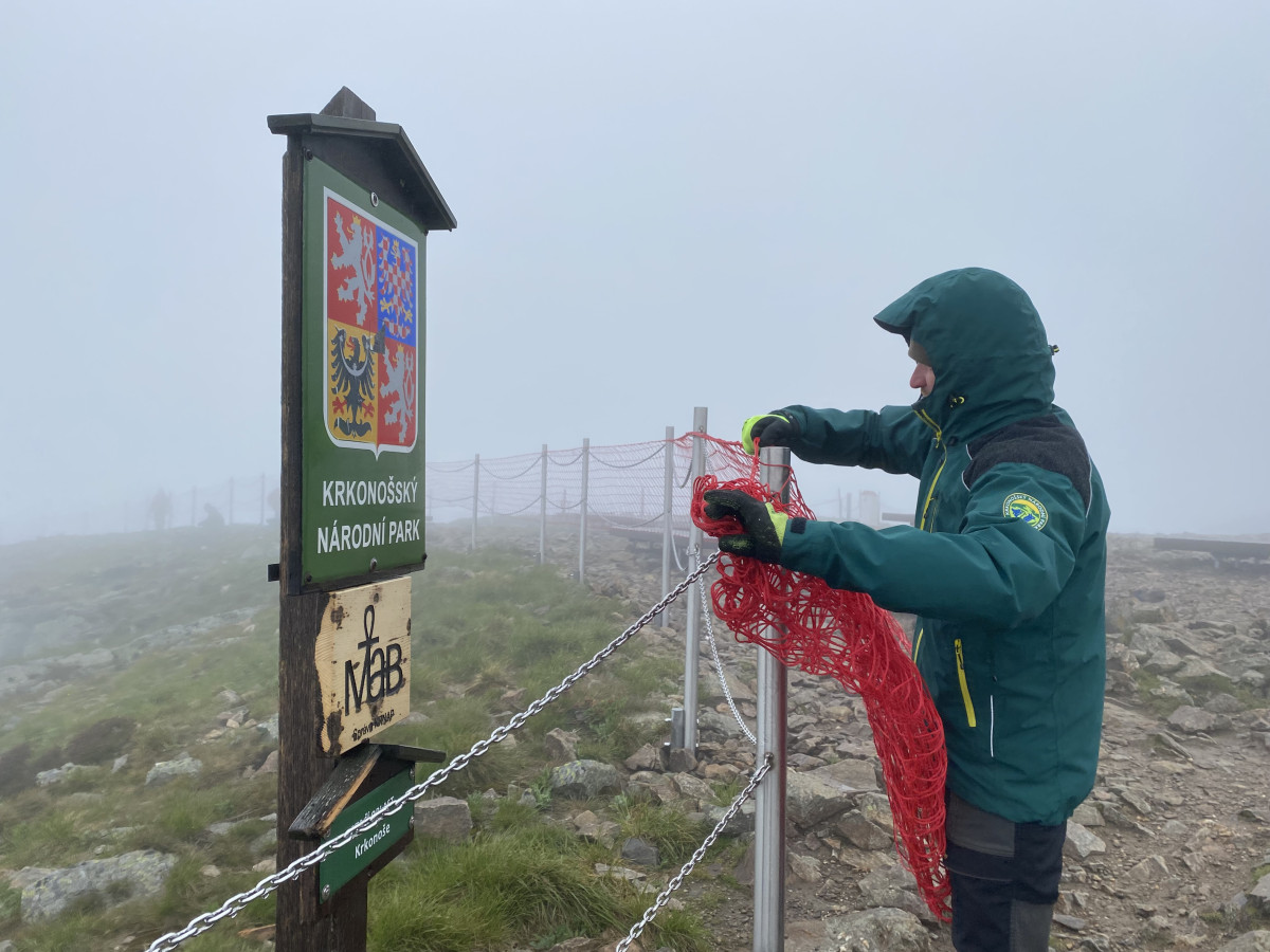 Na Sněžce opět správci rozmístili červené sítě, chrání přírodu před turisty