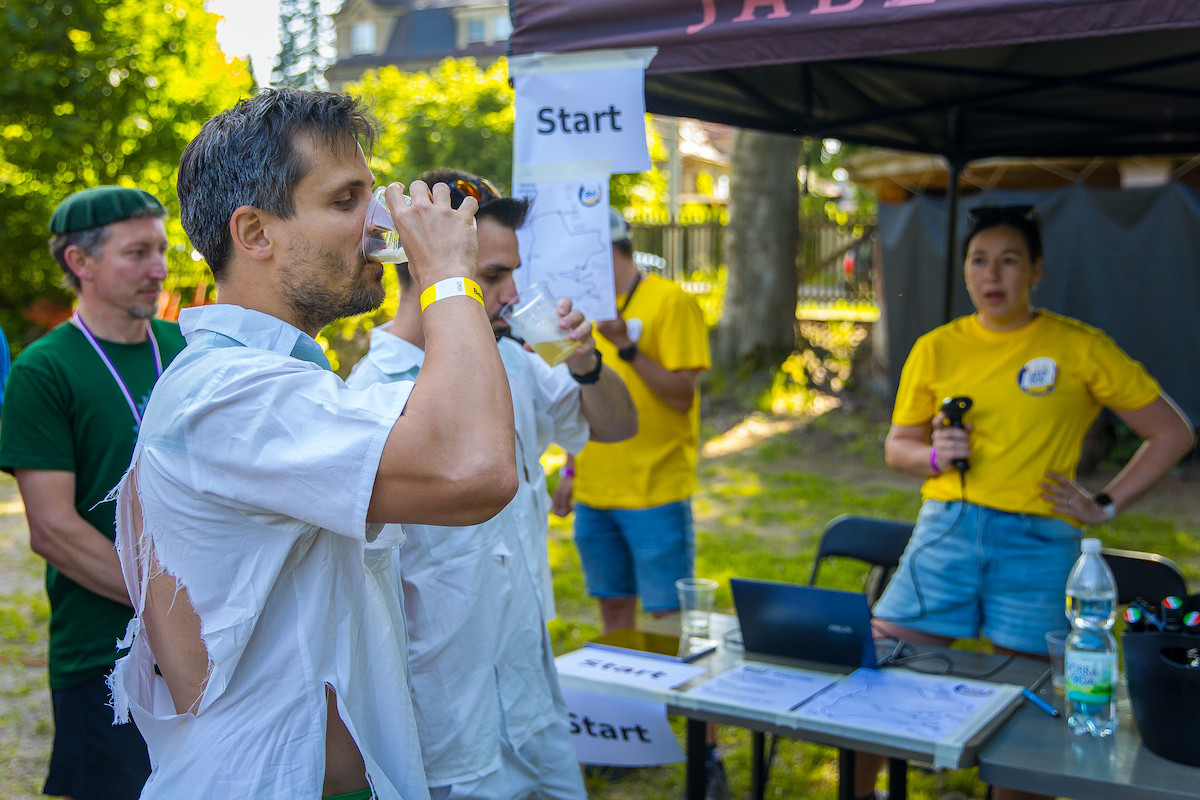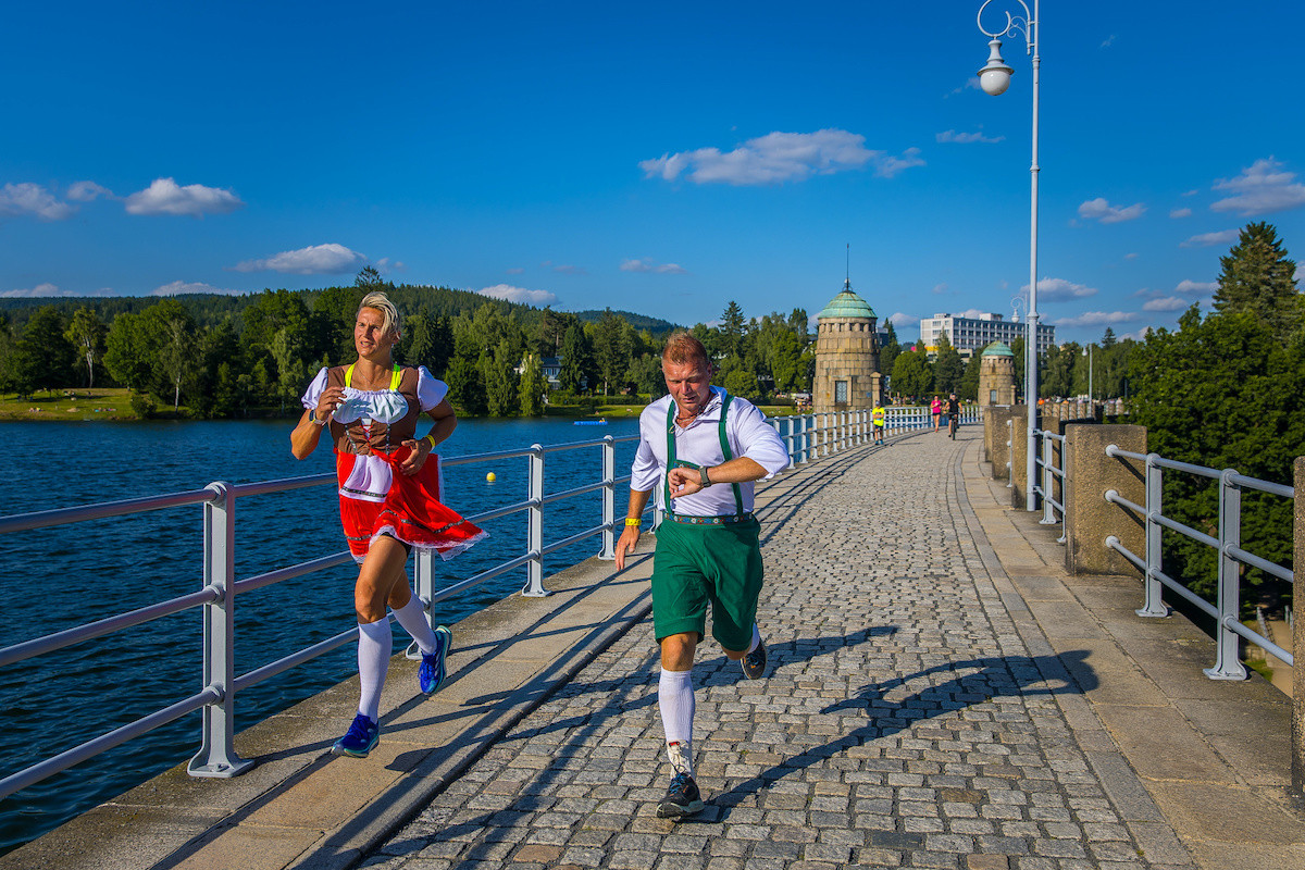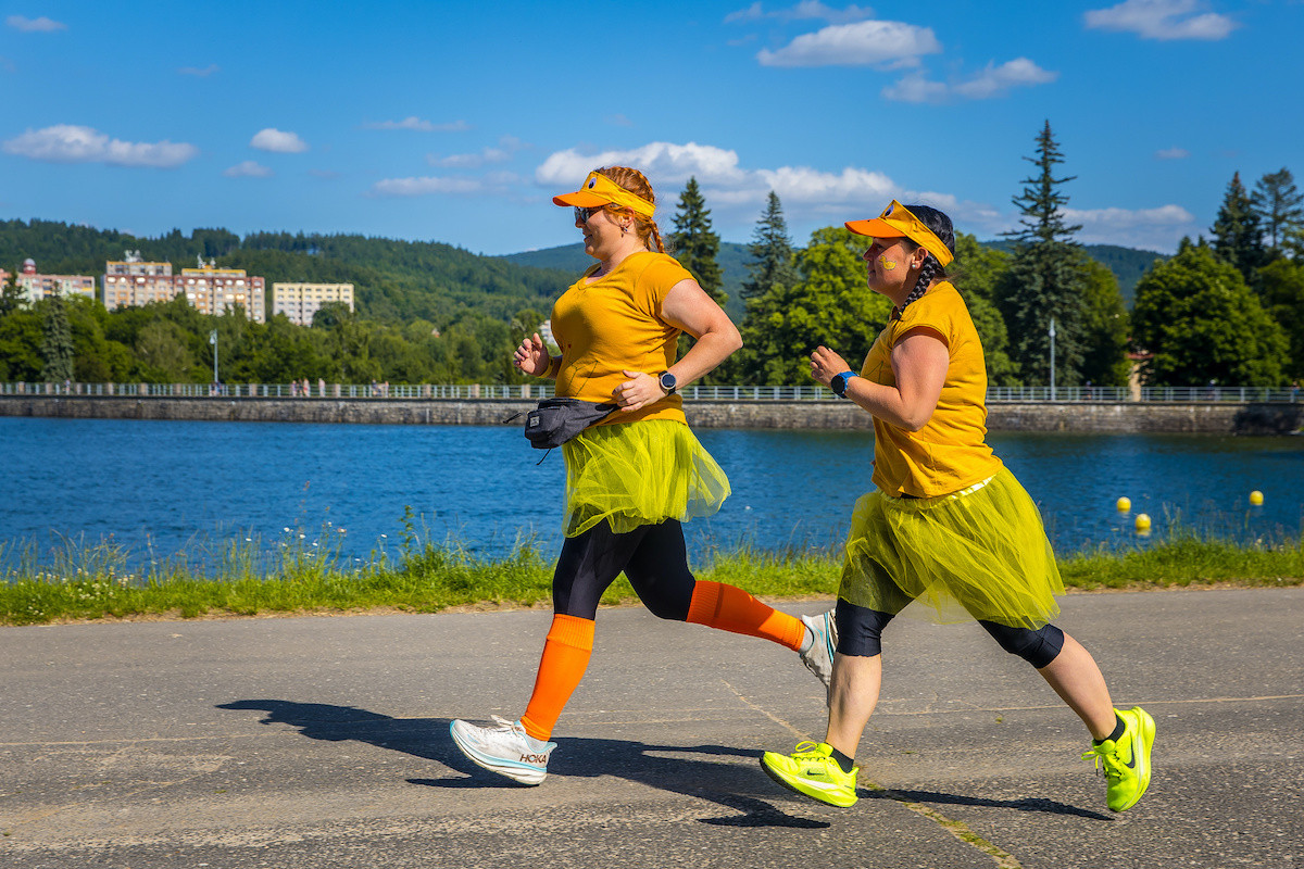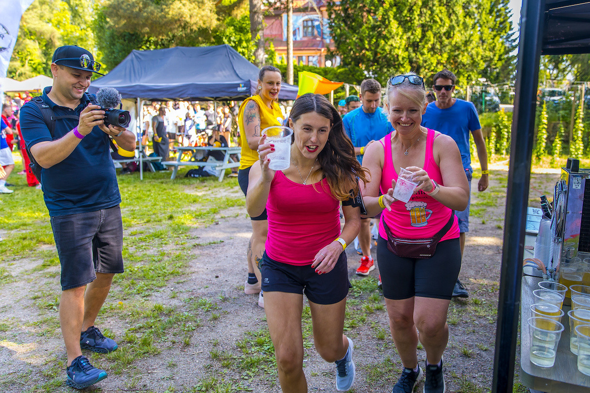 Pivní běh kolem přehrady. Vítězové zvládli tři a půl kilometru a šest malých piv za čtrnáct minut