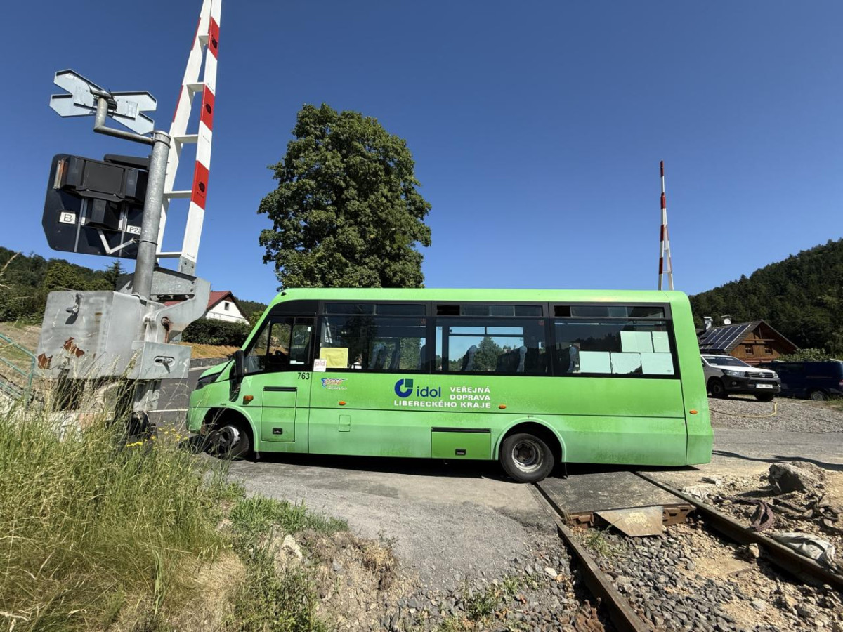 Malý autobus, zajíždějící na náves, už na přejezdu v Andělské Hoře problémy nemá. Větší autobusy však ano.