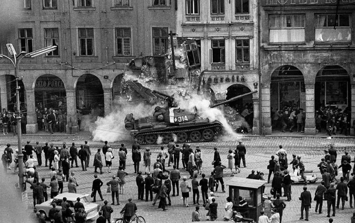 Ikonická fotografie tanku bořícího podloubí v Liberci během 21. srpna 1968.