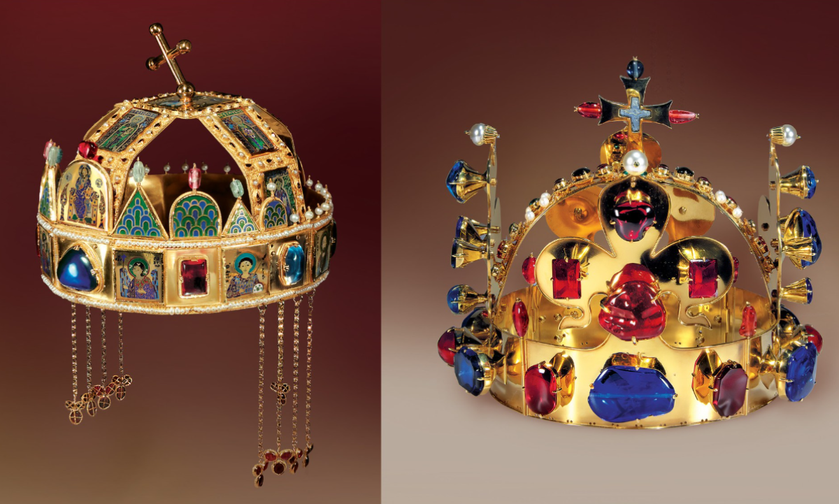 Dvě ze tří vystavených korun panovníků naší historie.
