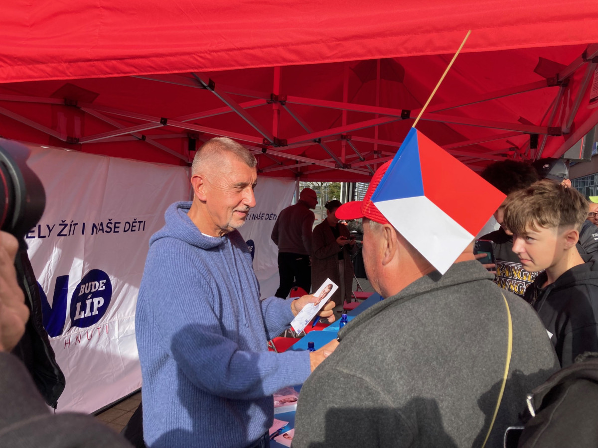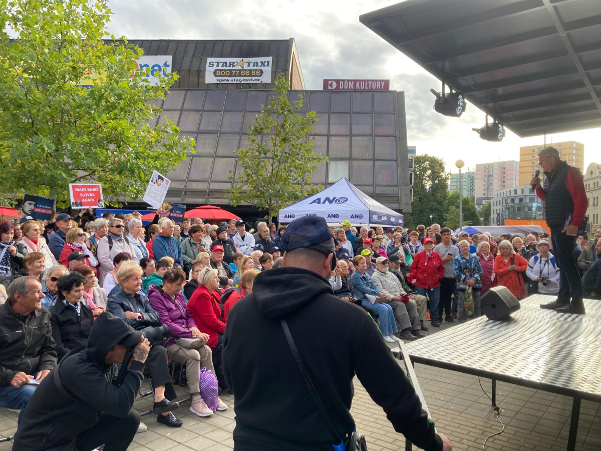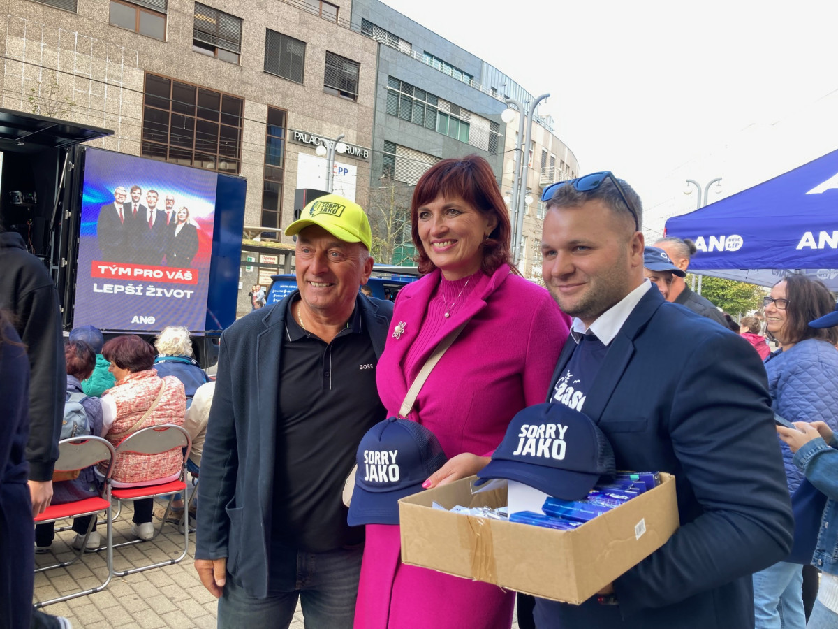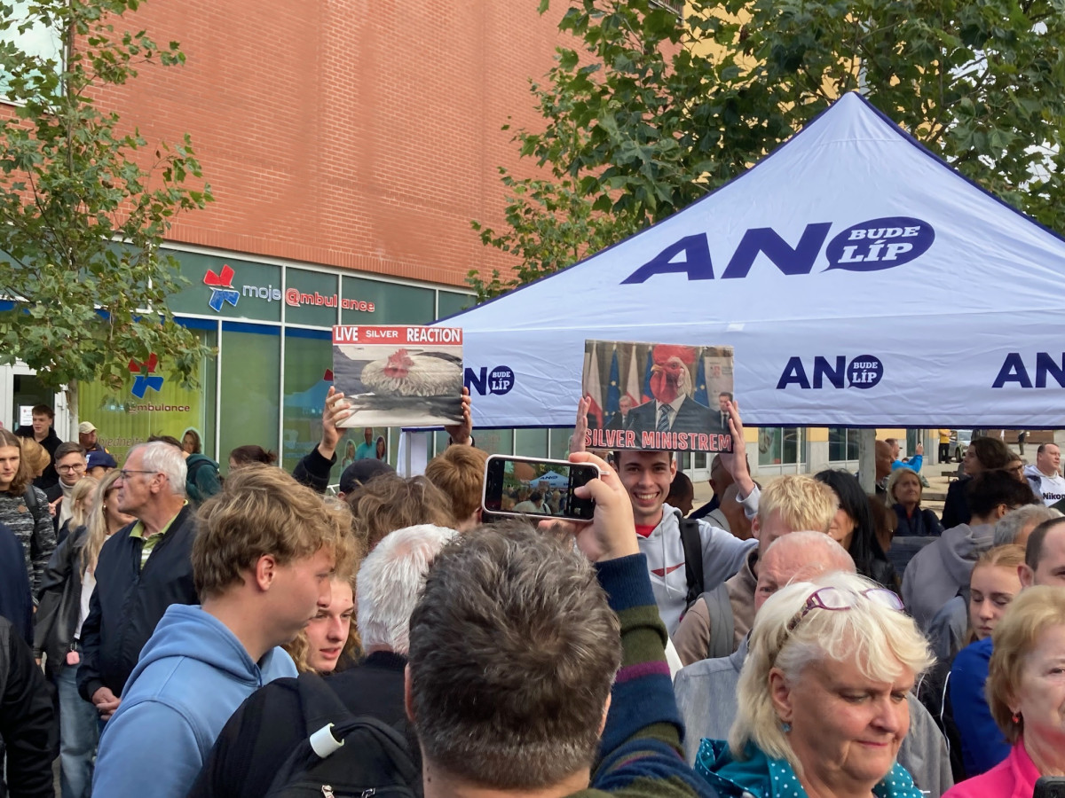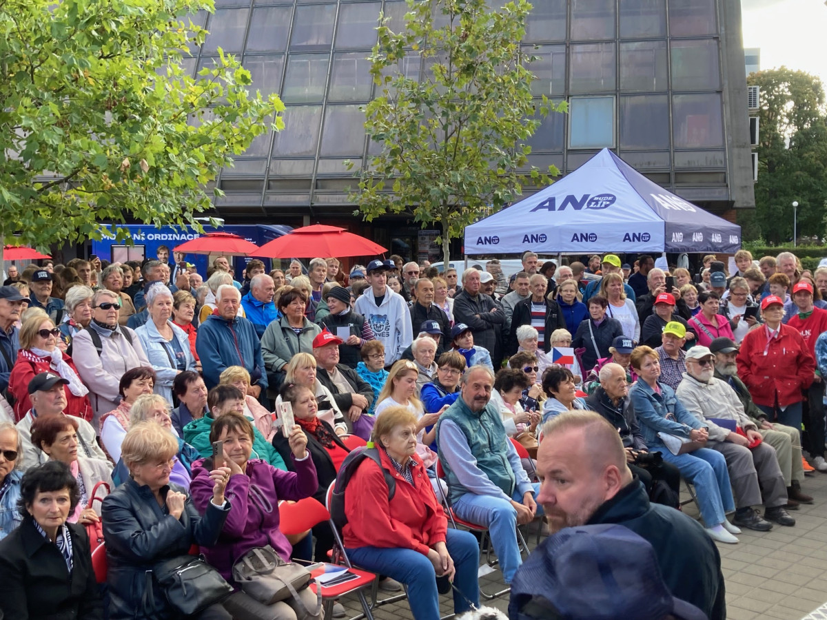 Kšiltovky, trička a fotka se známou tváří. Na mítink ANO dorazilo na 350 lidí, včetně odpůrců
