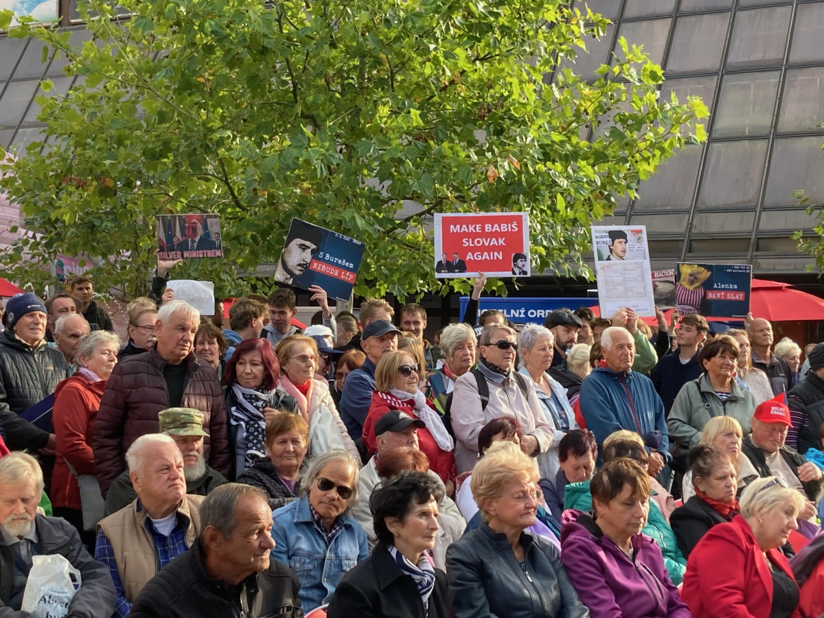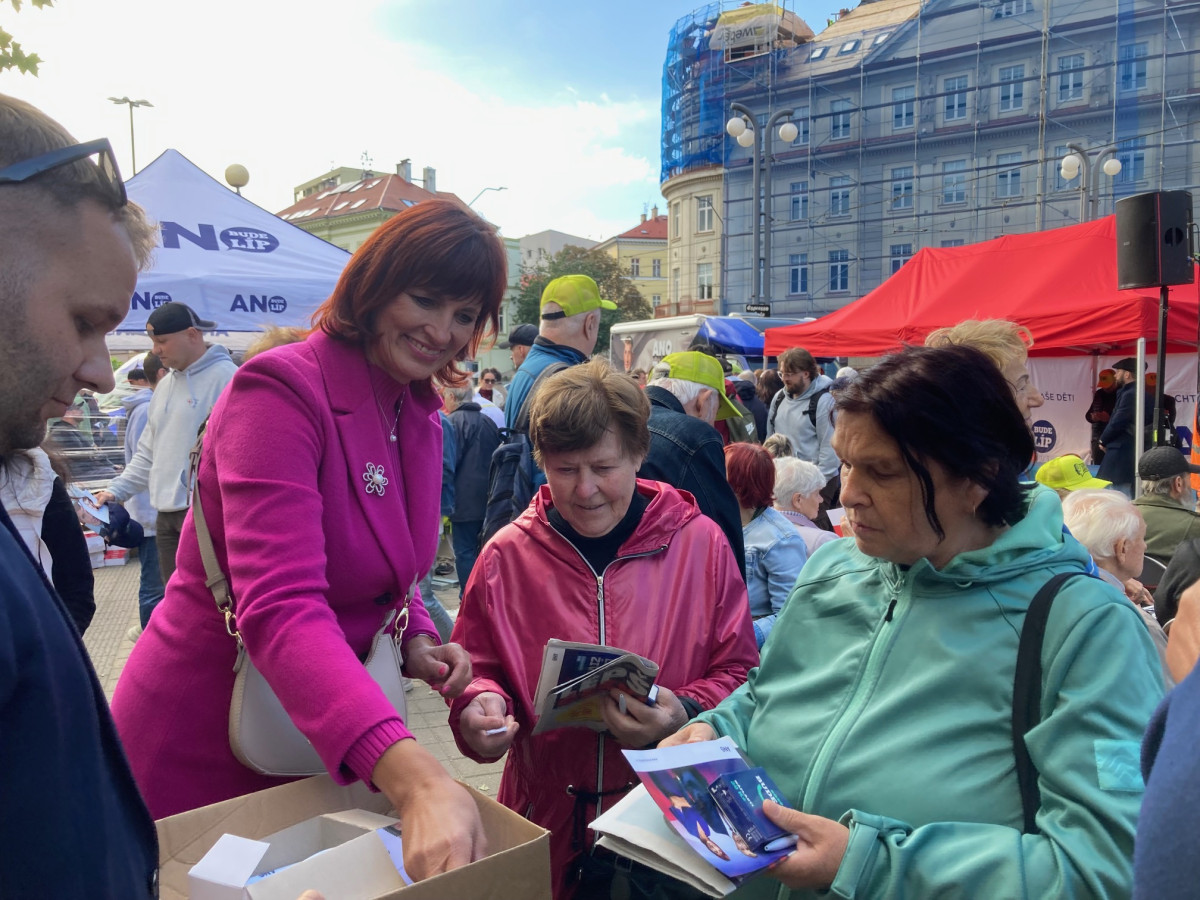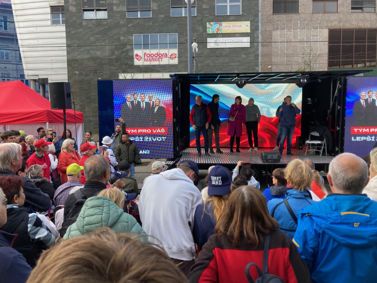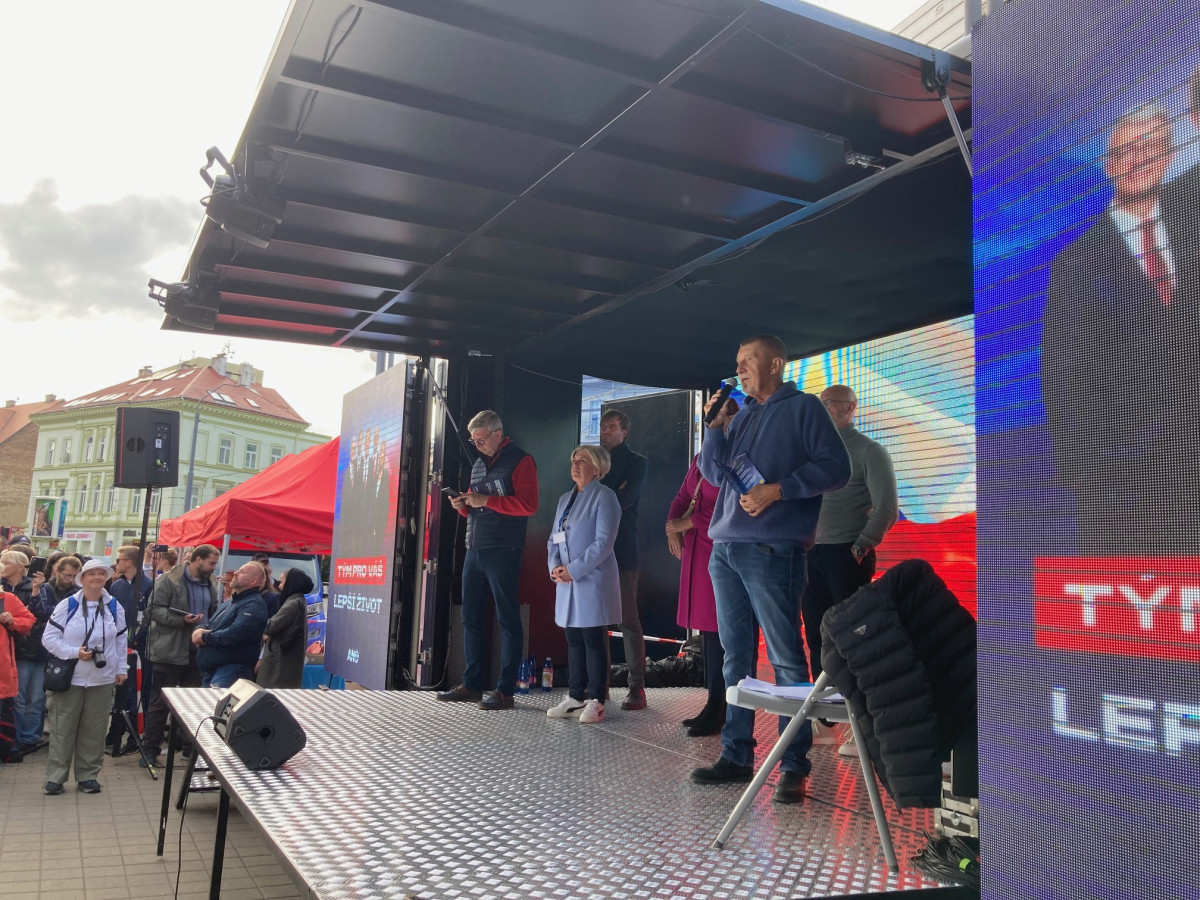Kšiltovky, trička a fotka se známou tváří. Na mítink ANO dorazilo na 350 lidí, včetně odpůrců