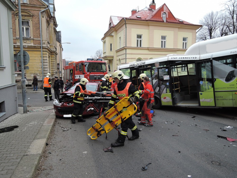 Střet auta s autobusem v Jablonci. Foto: HZS LK
