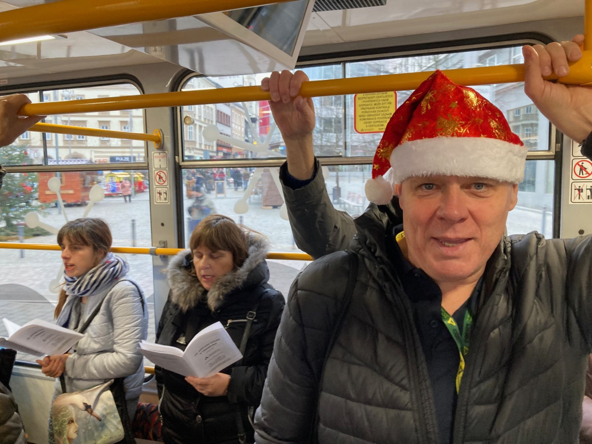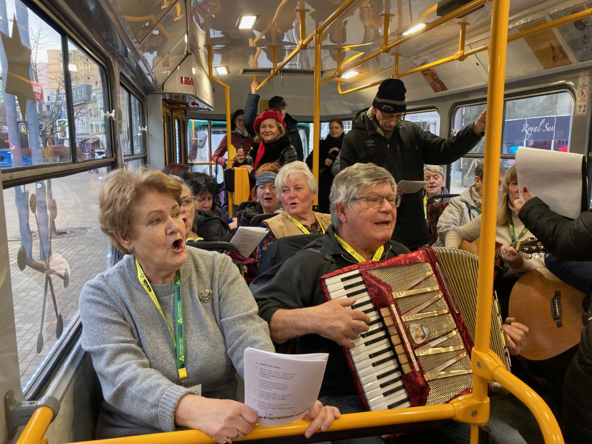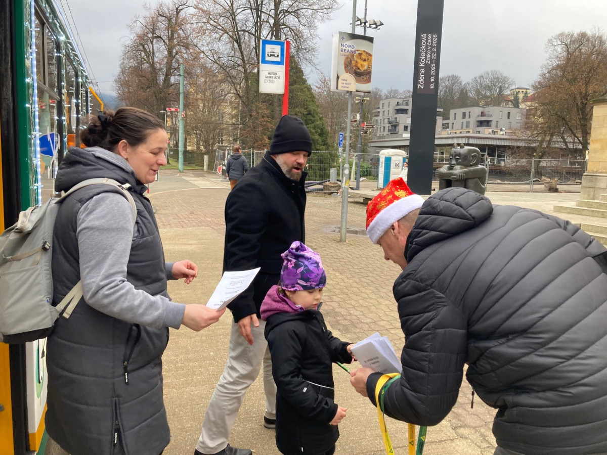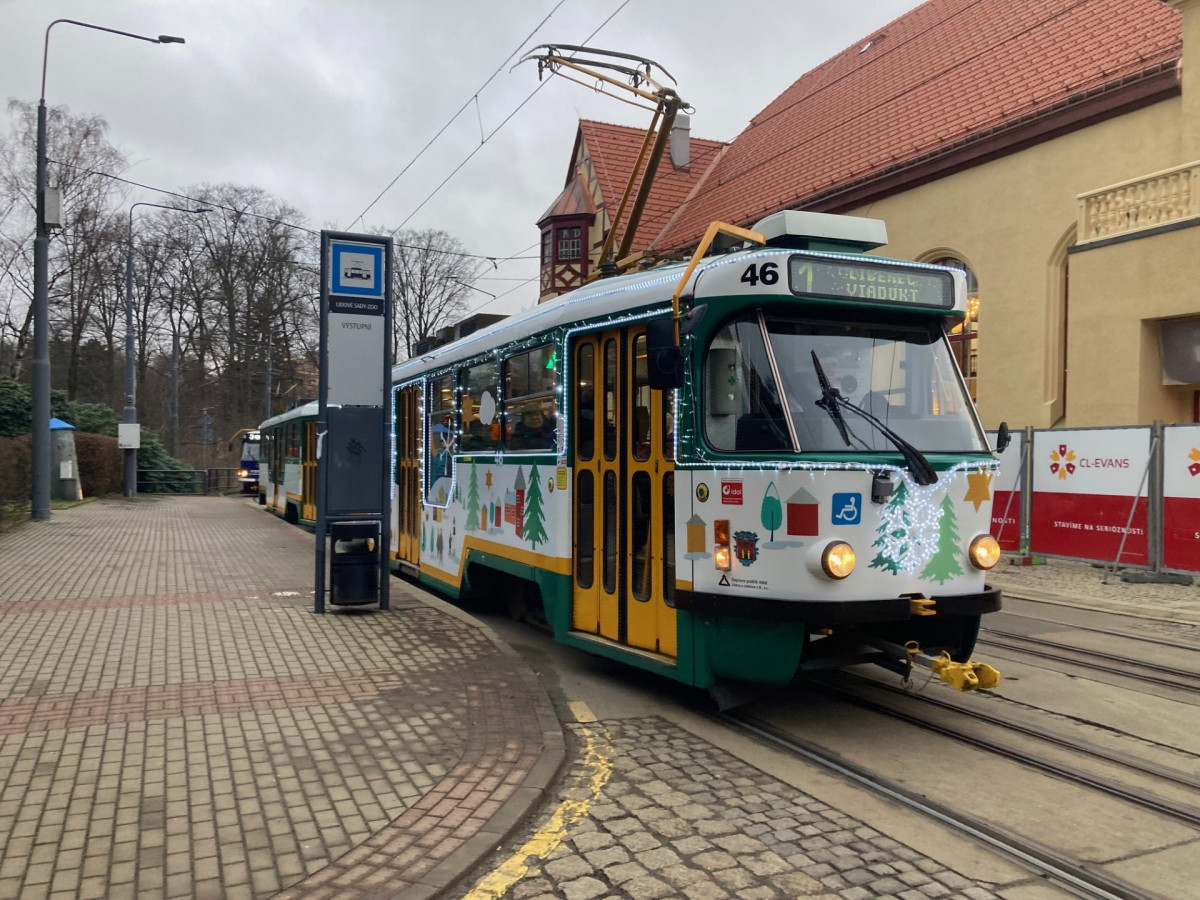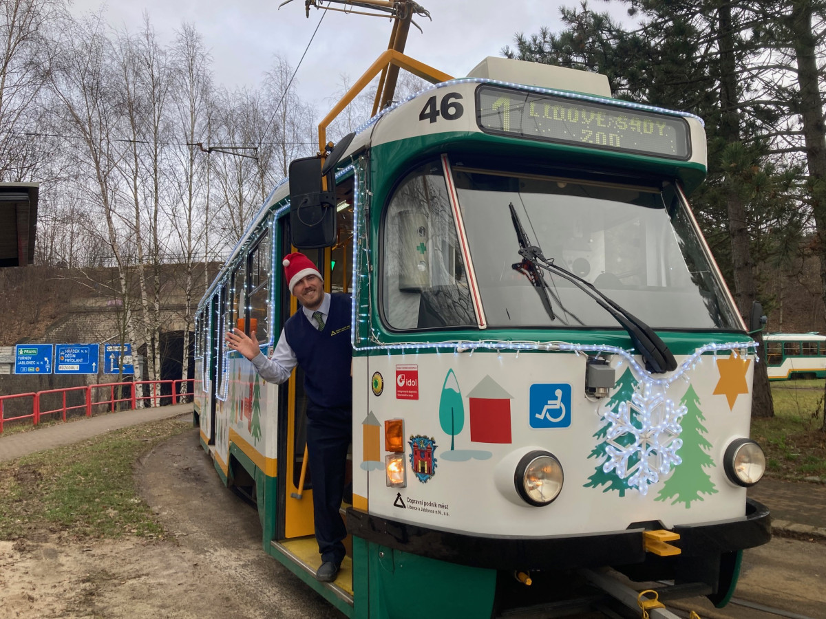 Z vánočně zdobené tramvaje se v Liberci nesl zpěv koled. Cestující svátečně naladila
