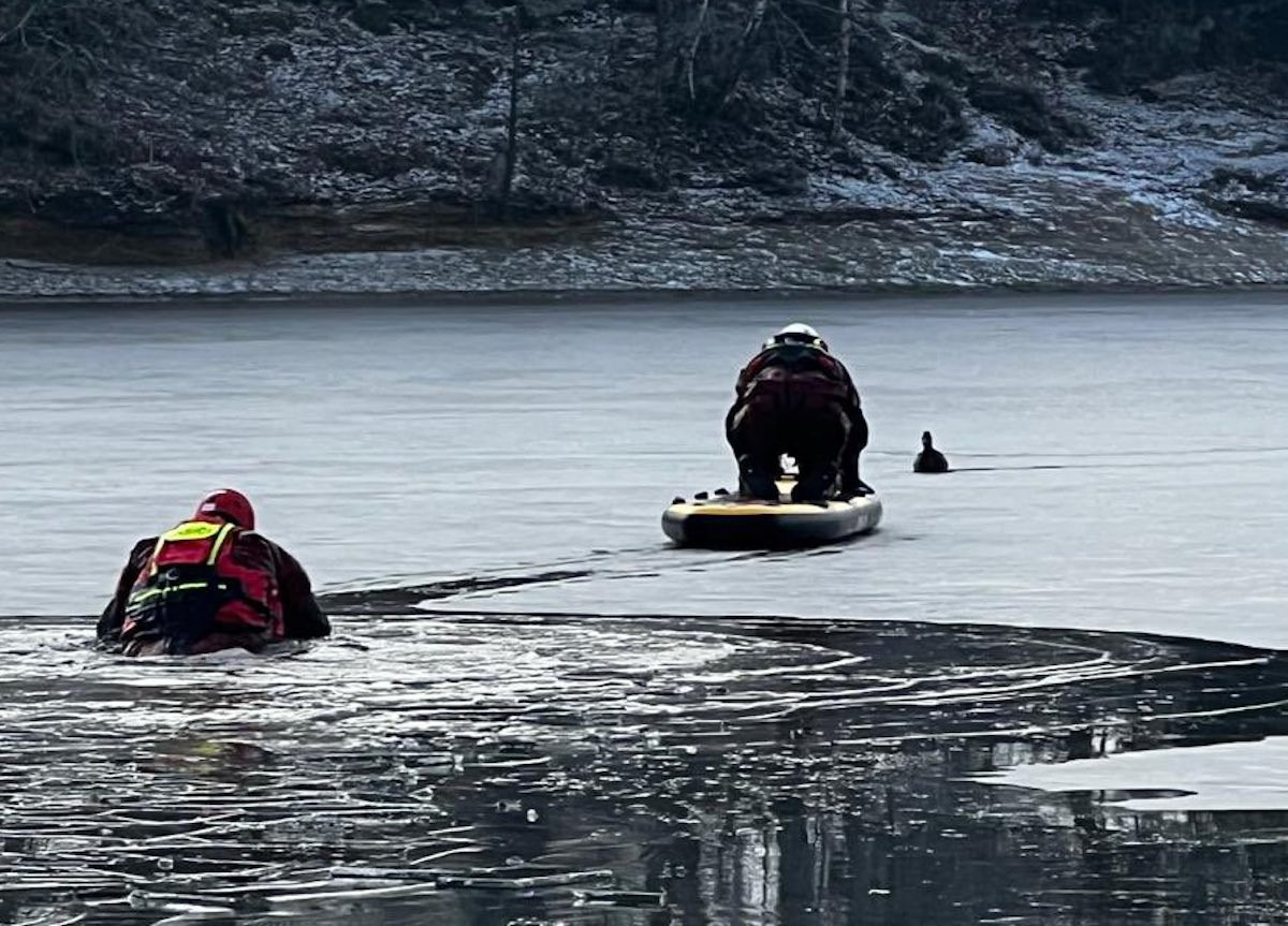 Zásah hasičů na jablonecké přehradě. Kachna na hladině přimrzla k ledu