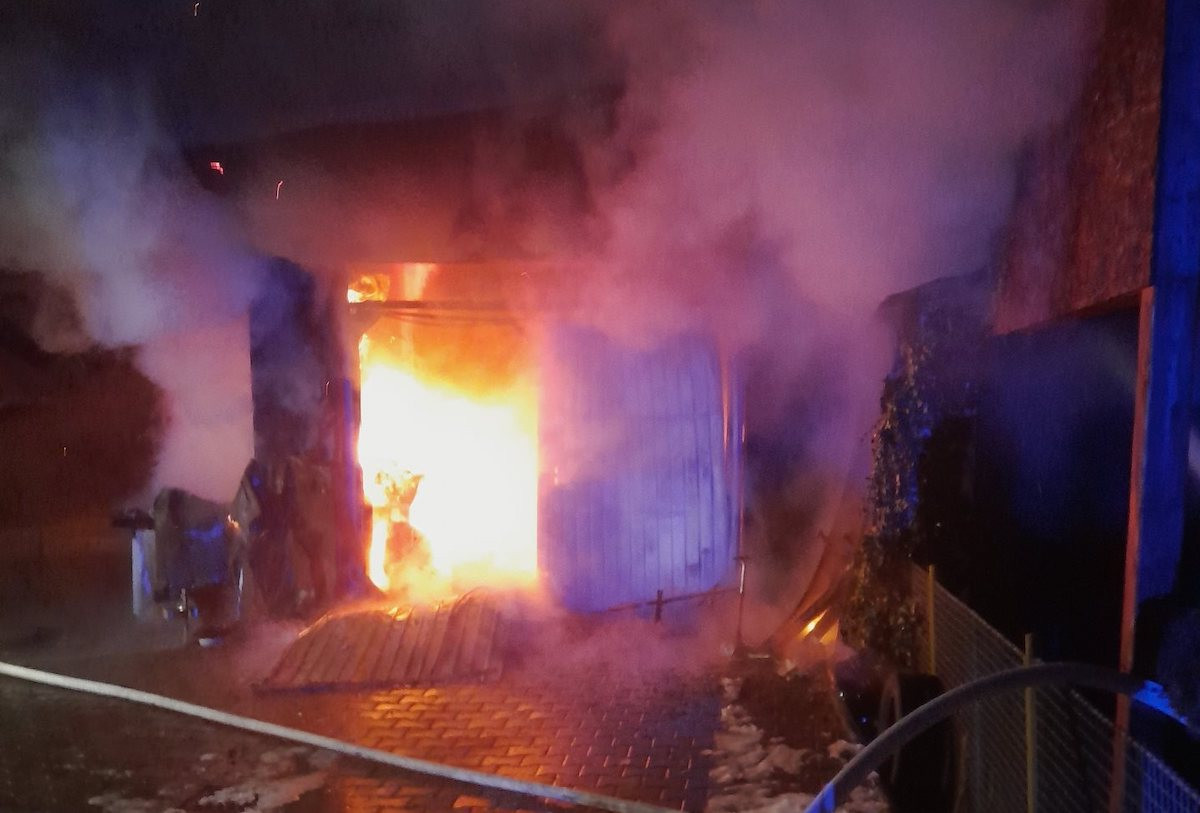 Požár garáže v Přepeřích. Vedlejší dům se hasičům podařilo ochránit