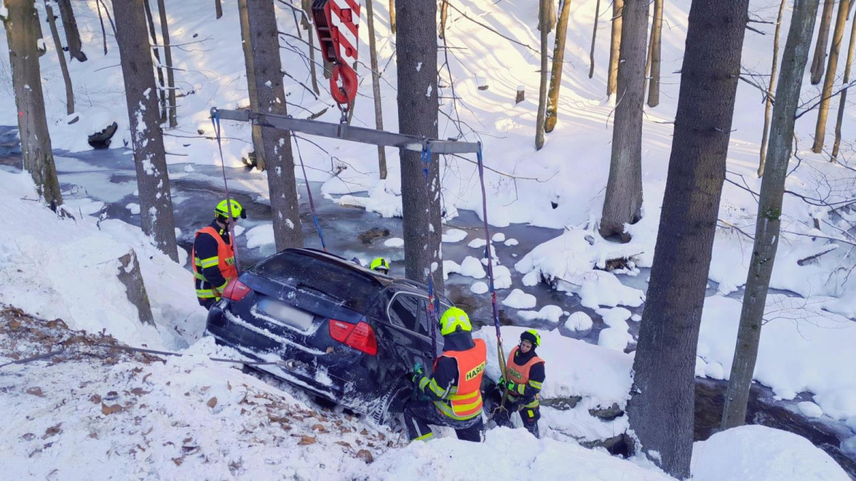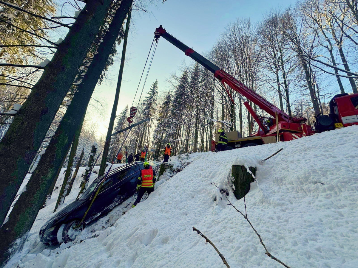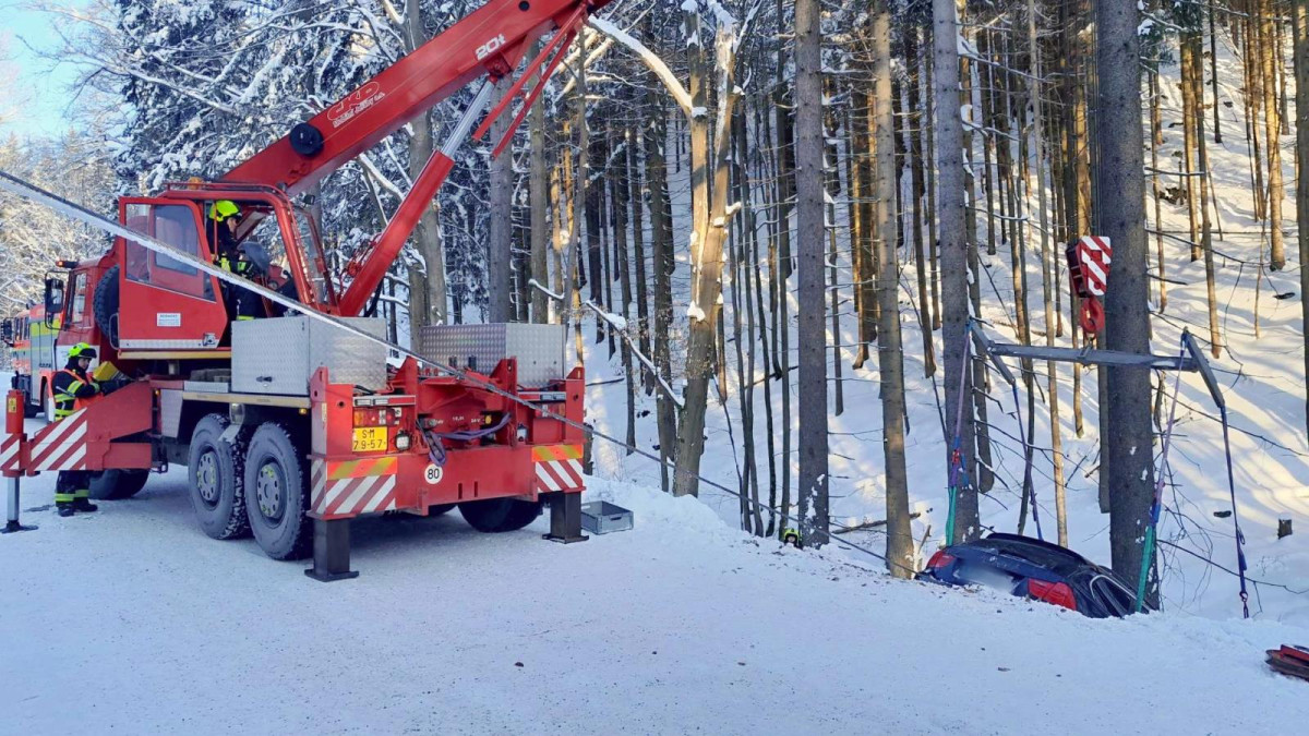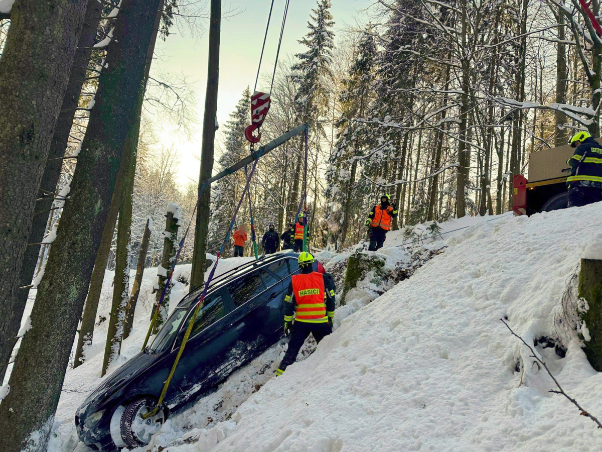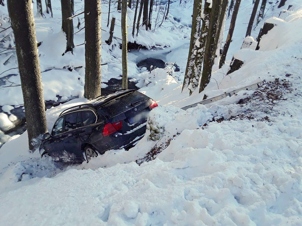 Auto sjelo na Semilsku ze silnice do čtyřmetrového srázu. Náraz ztlumila sněhová peřina