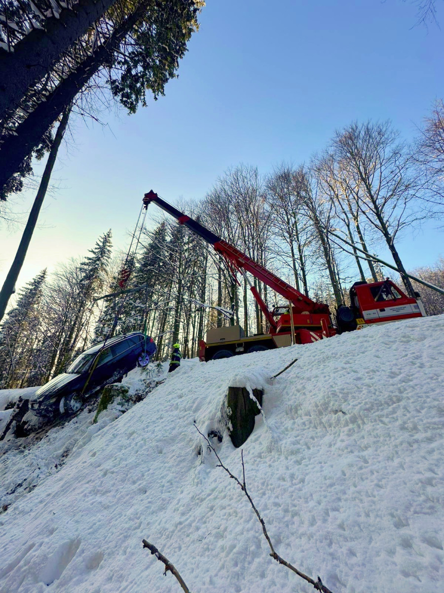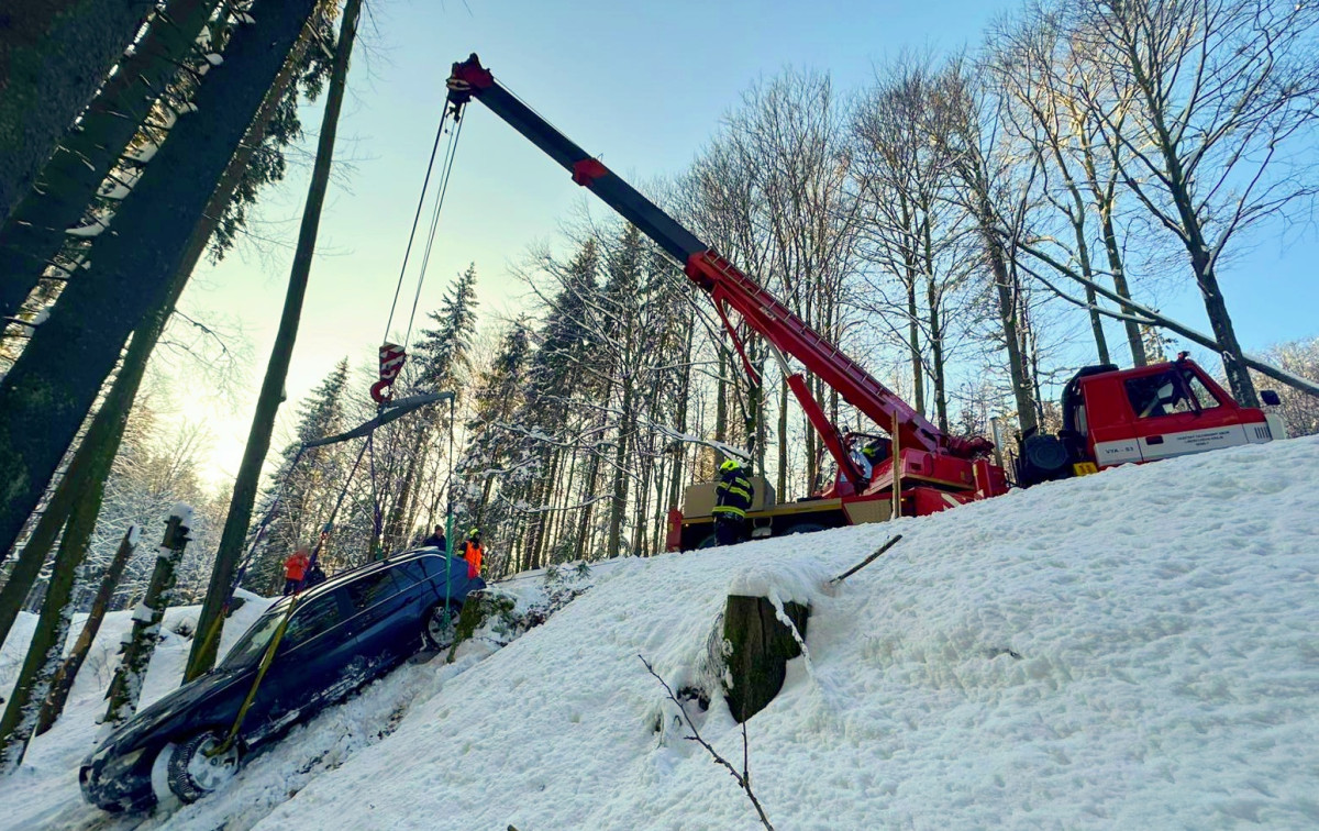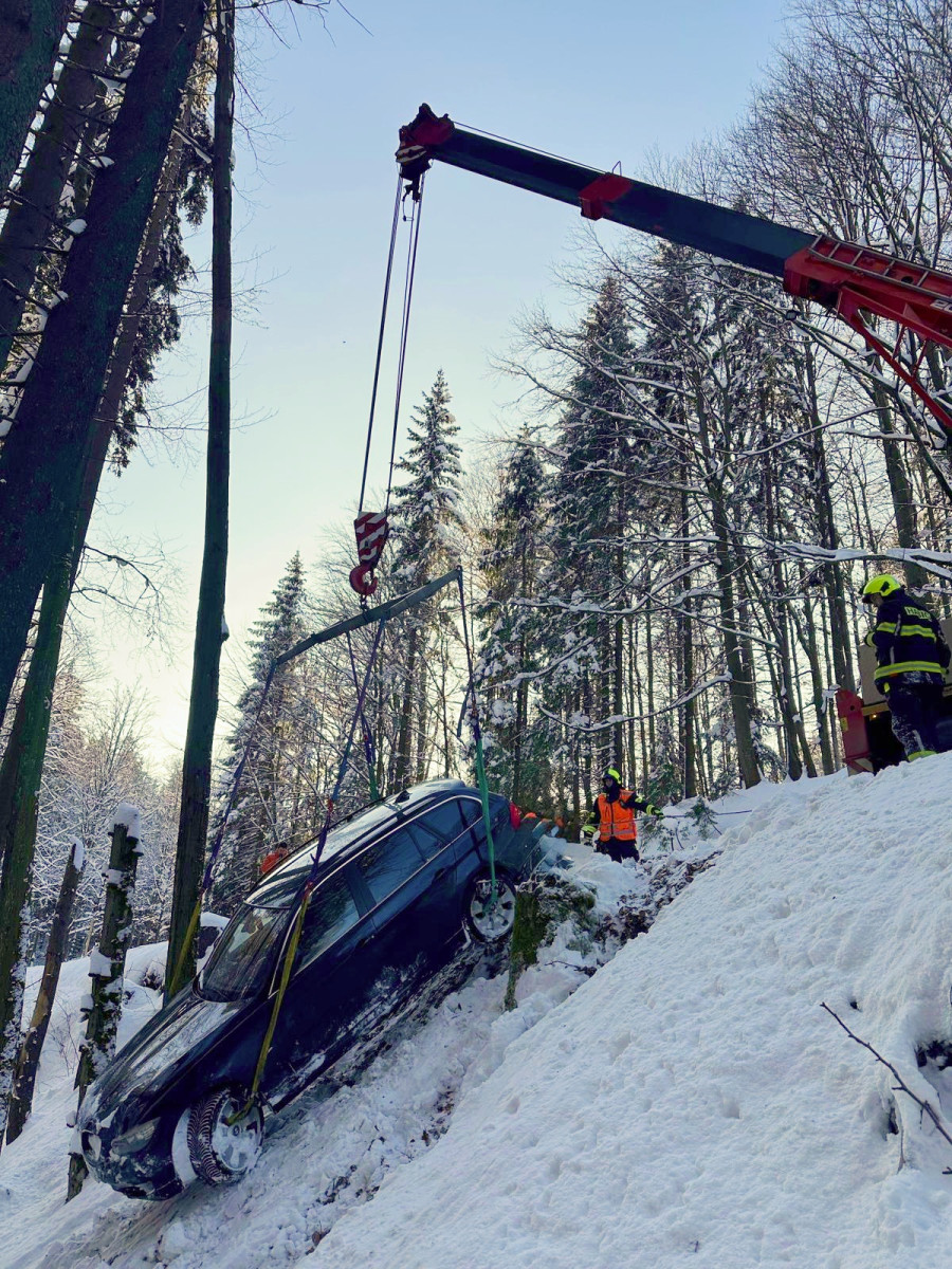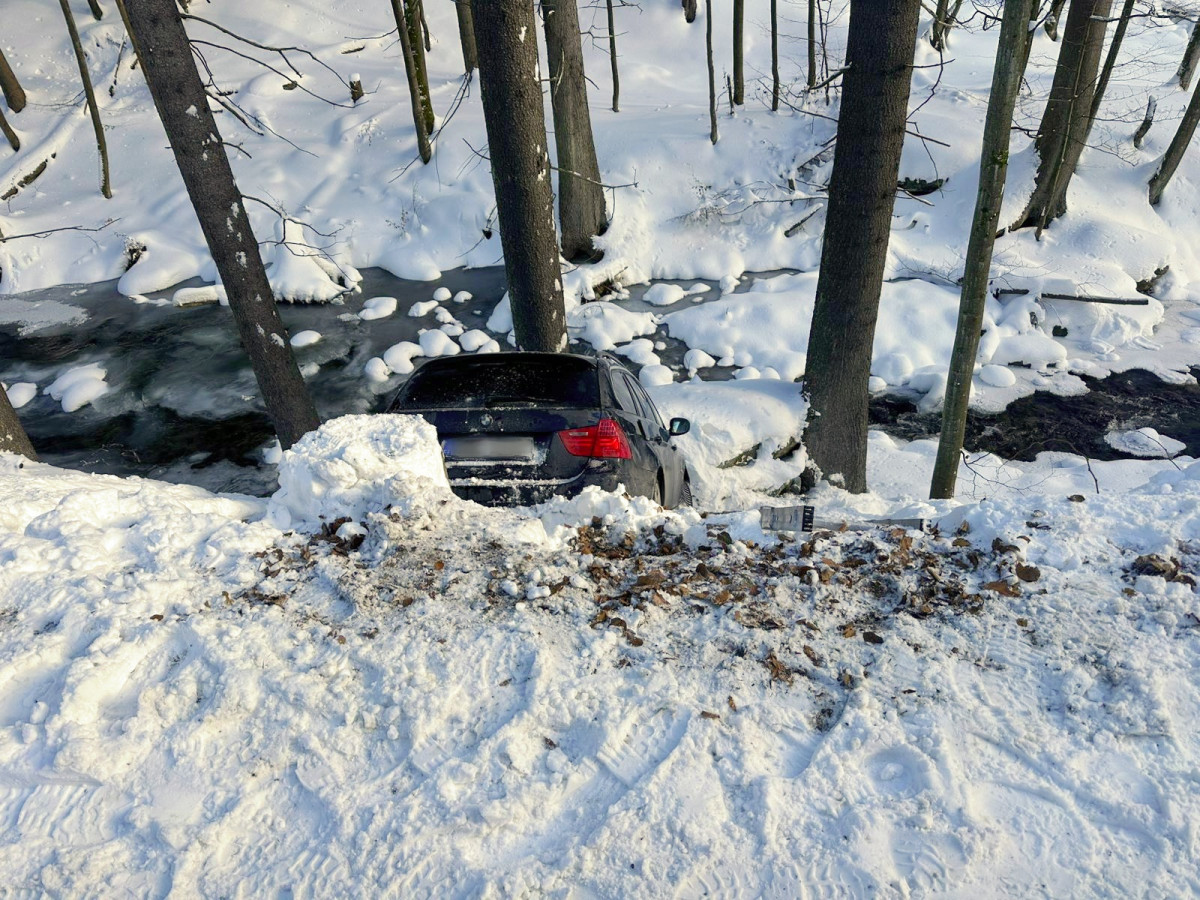Auto sjelo na Semilsku ze silnice do čtyřmetrového srázu. Náraz ztlumila sněhová peřina