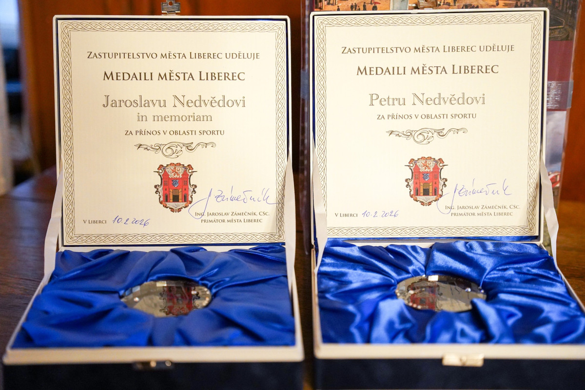 Petr Nedvěd převzal Medaile města Liberec za přínos v oblasti sportu pro sebe a svého otce Jaroslava Nedvěda v zasedací místnosti liberecké radnice.
