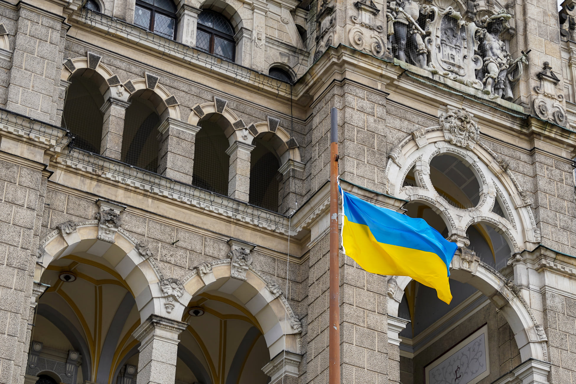 Čtyři roky války na Ukrajině. Před libereckou radnicí je připomíná vlajka Ukrajiny