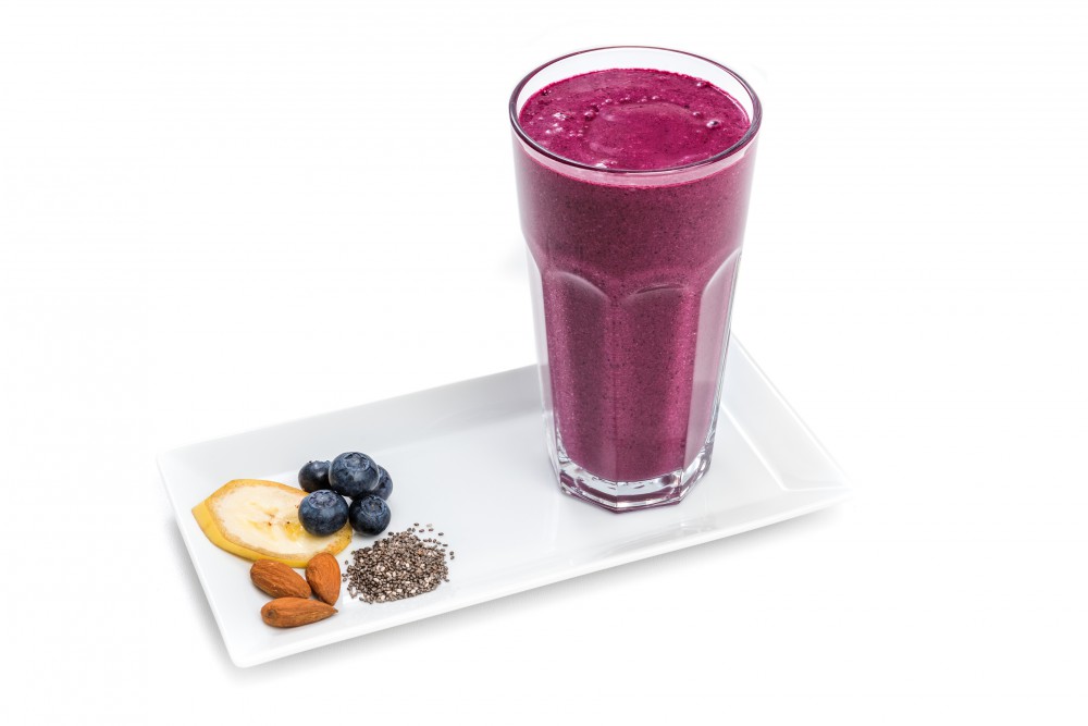Koktejl: mandlové mléko, banán, borůvky, chia