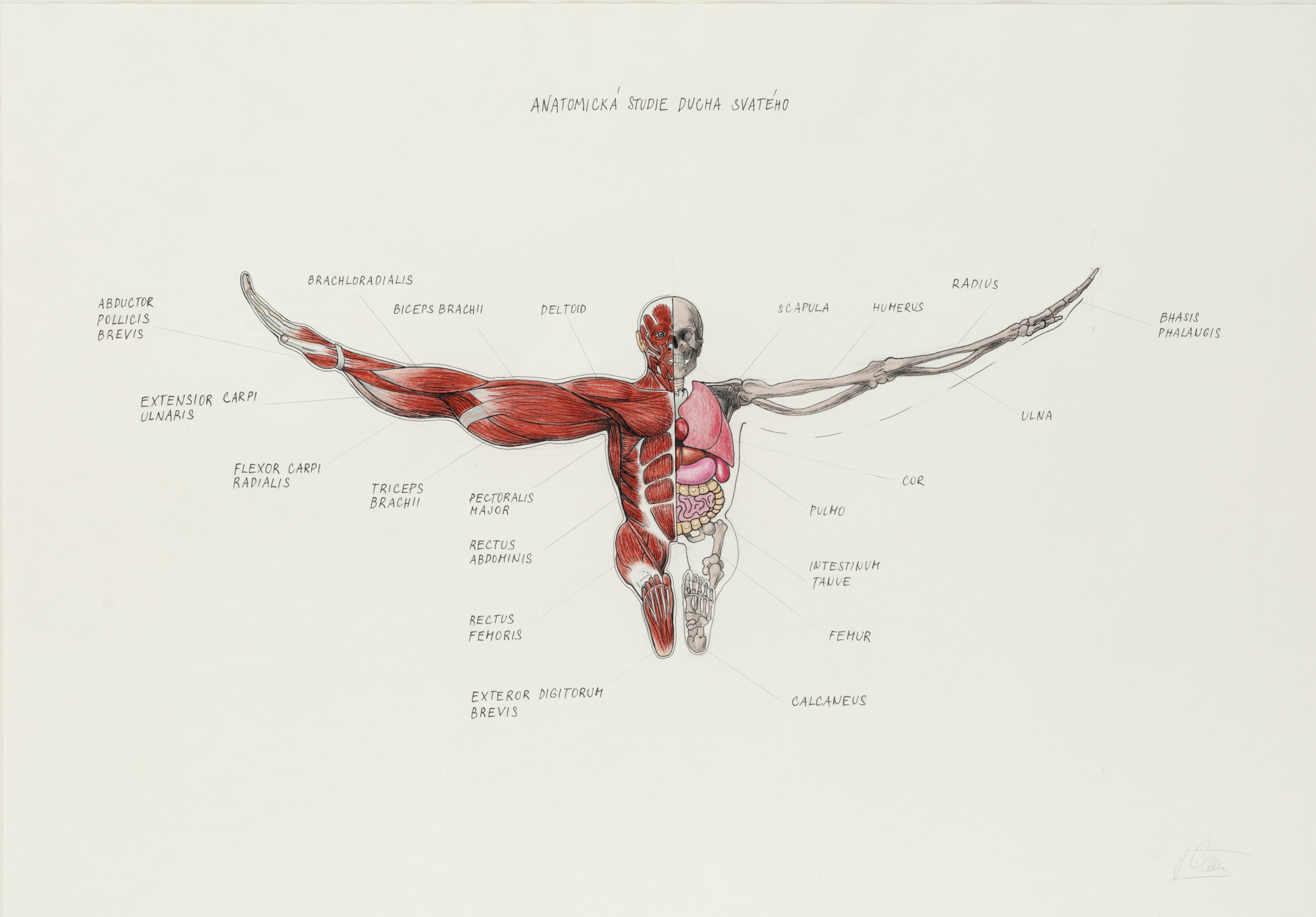 Jiří Černický, Anatomická studie Ducha svatého, 2020, 60 x 85 cm, tuš a pastelky na papíře