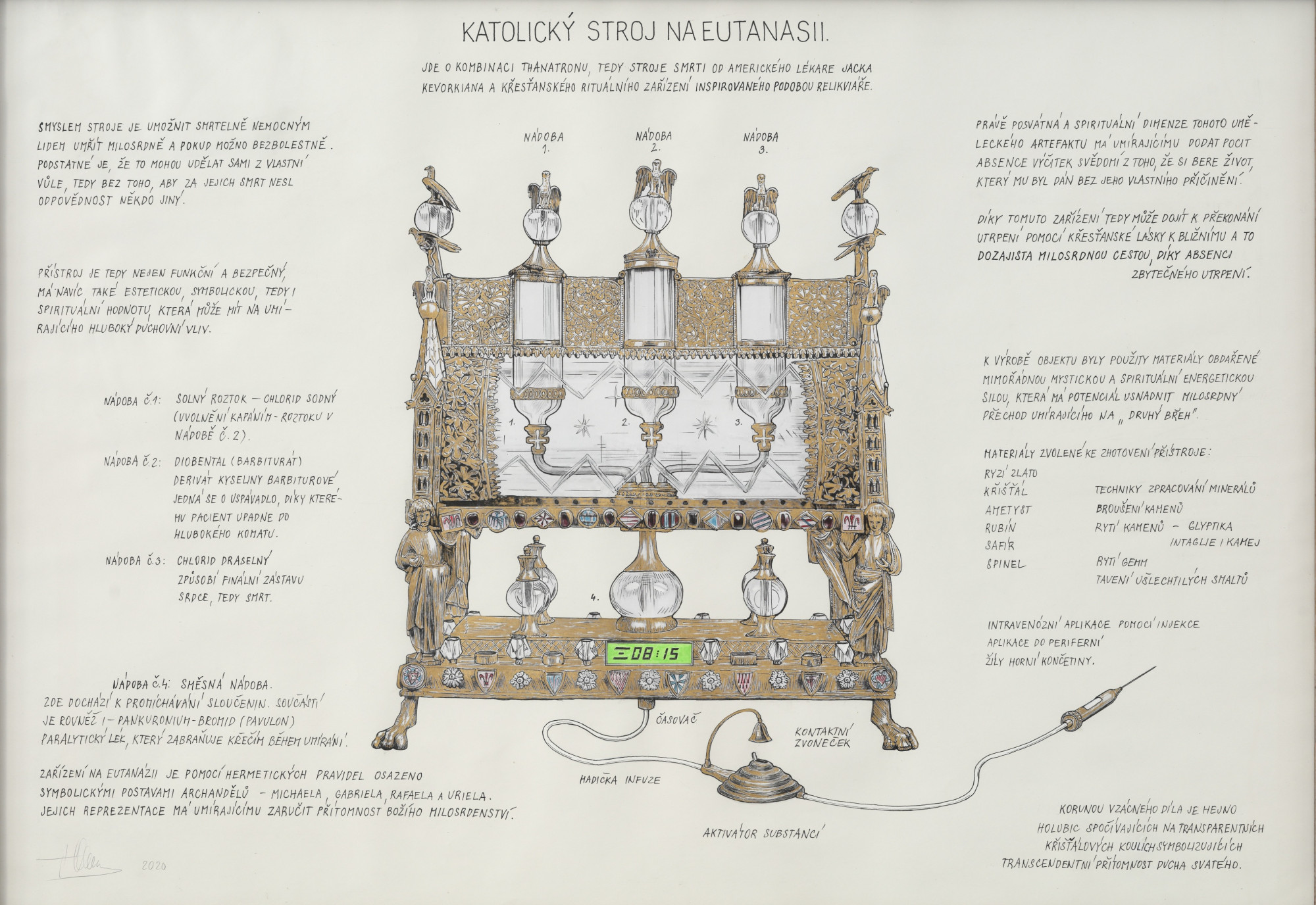 Jiří Černický, Katolický stroj na eutanazii, 2020, 111 x 121 cm, tuš a zlatá barva na papíře