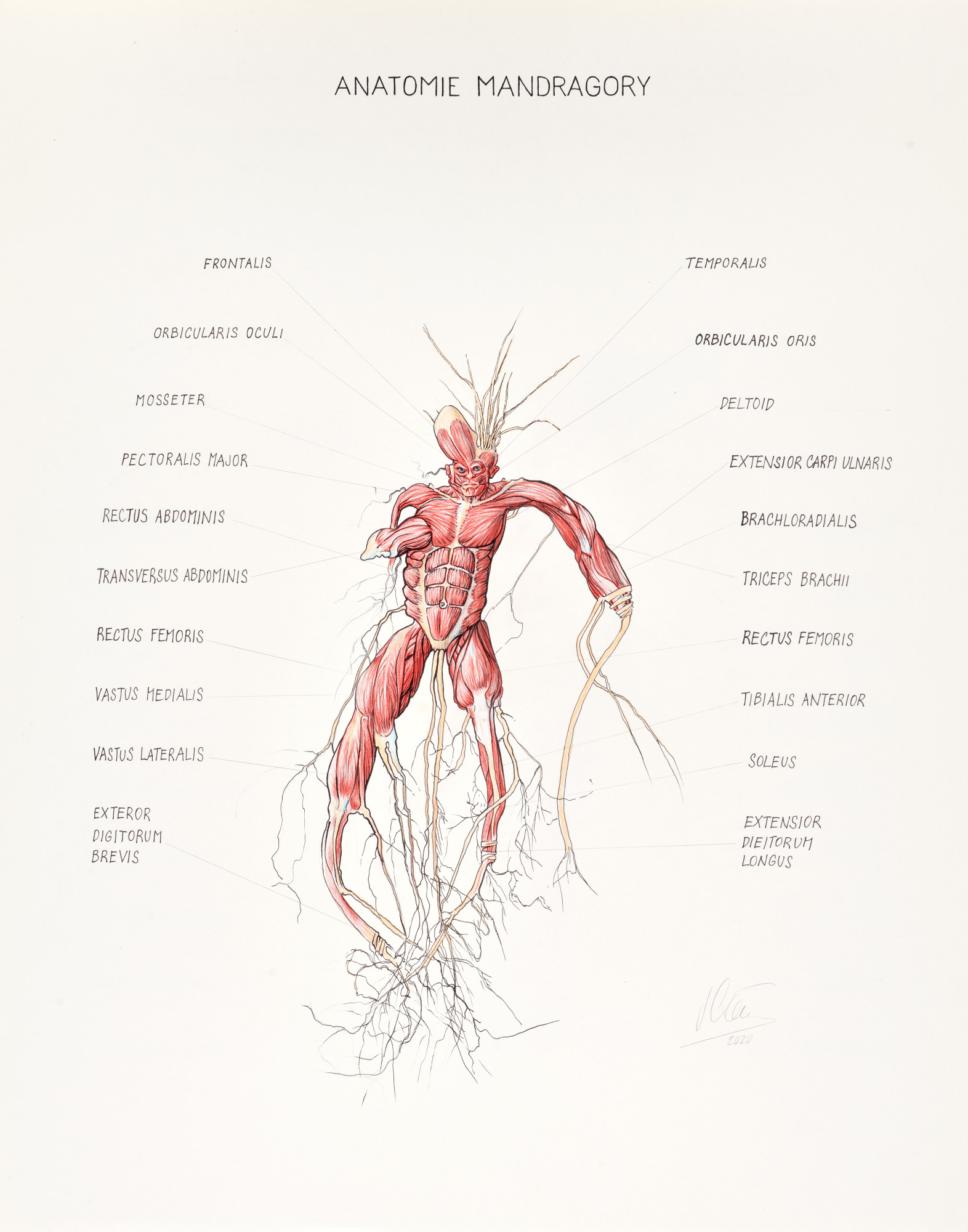 Jiří Černický, Anatomická studie mandragory, 2020, 85 x 60 cm, inkoust a pastelky na papíře