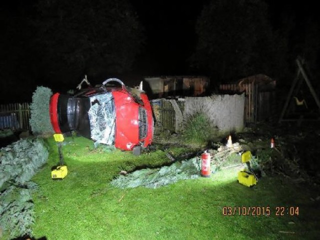 Mladý řidič zdemoloval Fabii i zahradu, sám se lehce zranil. Foto: Policie ČR