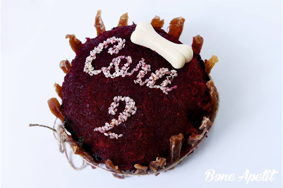 Hovězí dort s mrkví, červenou řepou, sušeným kachním, karobem a sezamem.