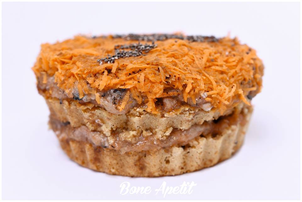 Hovězí dort s mrkví, červenou řepou, sušeným kachním, karobem a sezamem.