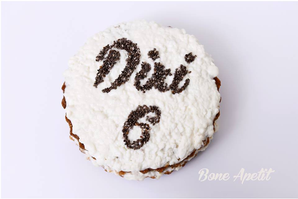 Piškotový dort s lososovým krémem, mrkví, karobem a chia semínky.
