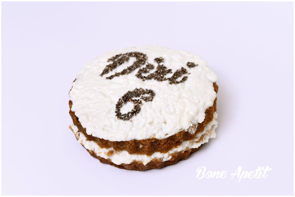 Piškotový dort s lososovým krémem, mrkví, karobem a chia semínky.