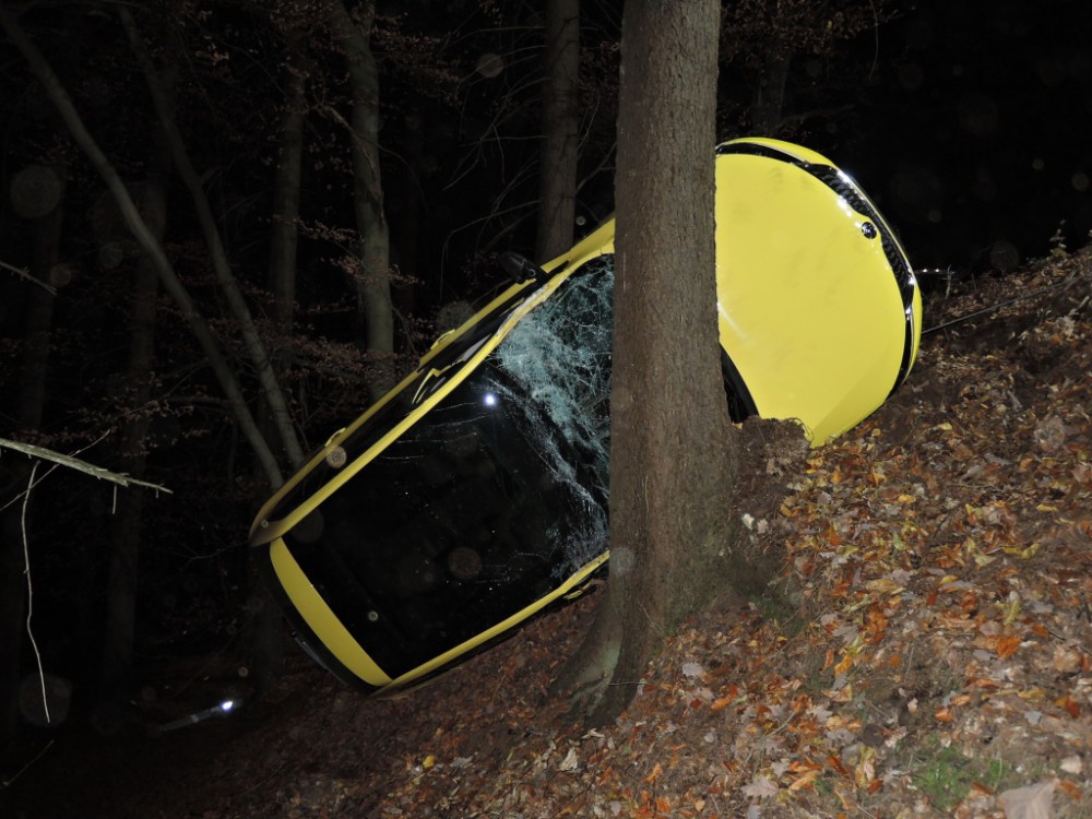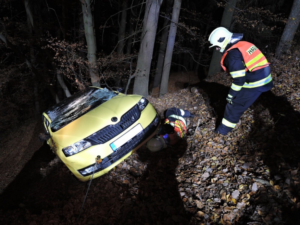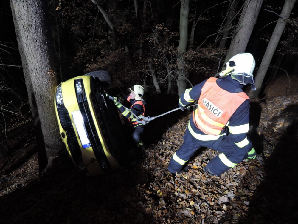 Těžká technika musela večer vyprošťovat auto z lesa. Řidič skončil v nemocnici