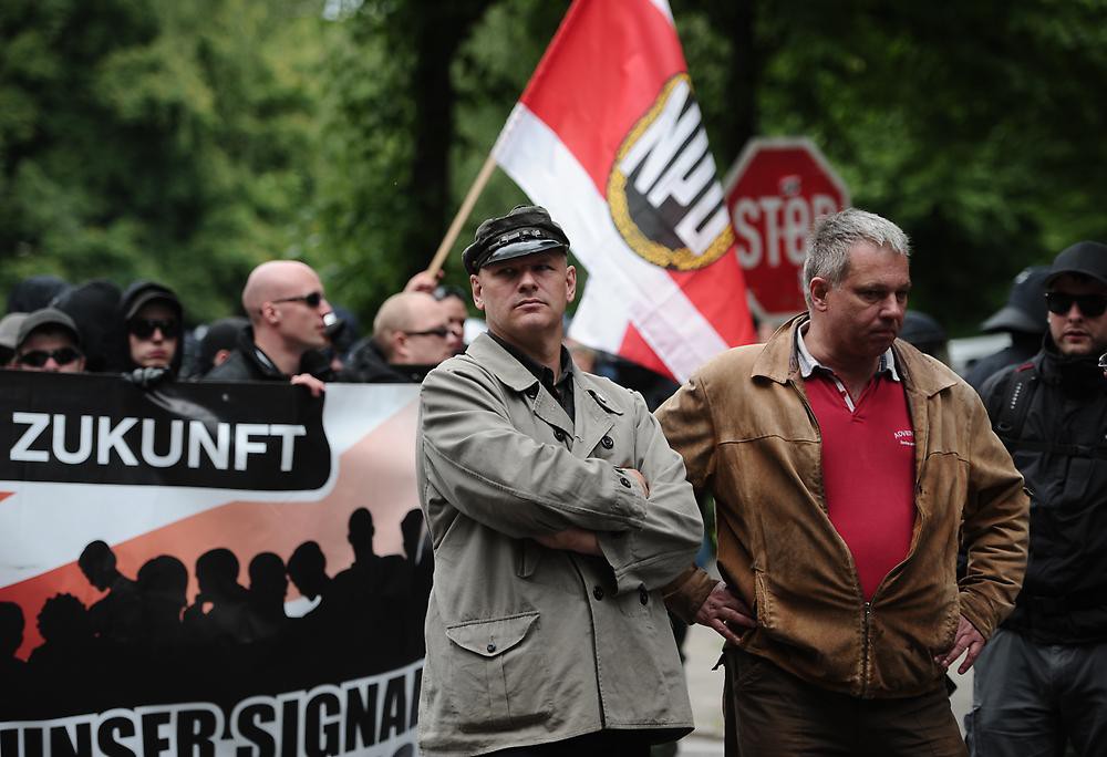 Christian Worch (vpravo) na demonstraci dnes už bývalé strany NPD. Z ní vzešla strana Die Rechte, jíž je Worch předsedou