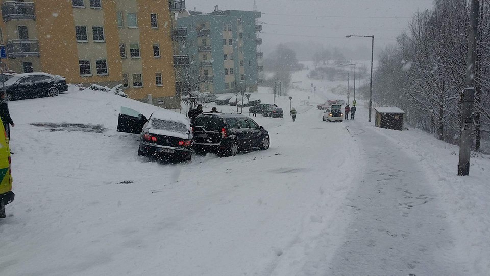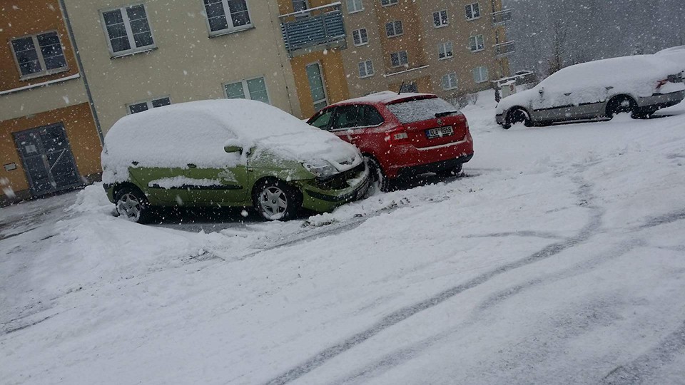 FOTO: Silnice v Zeleném Údolí se proměnila v kluziště, havarovala tam záchranka i hasiči