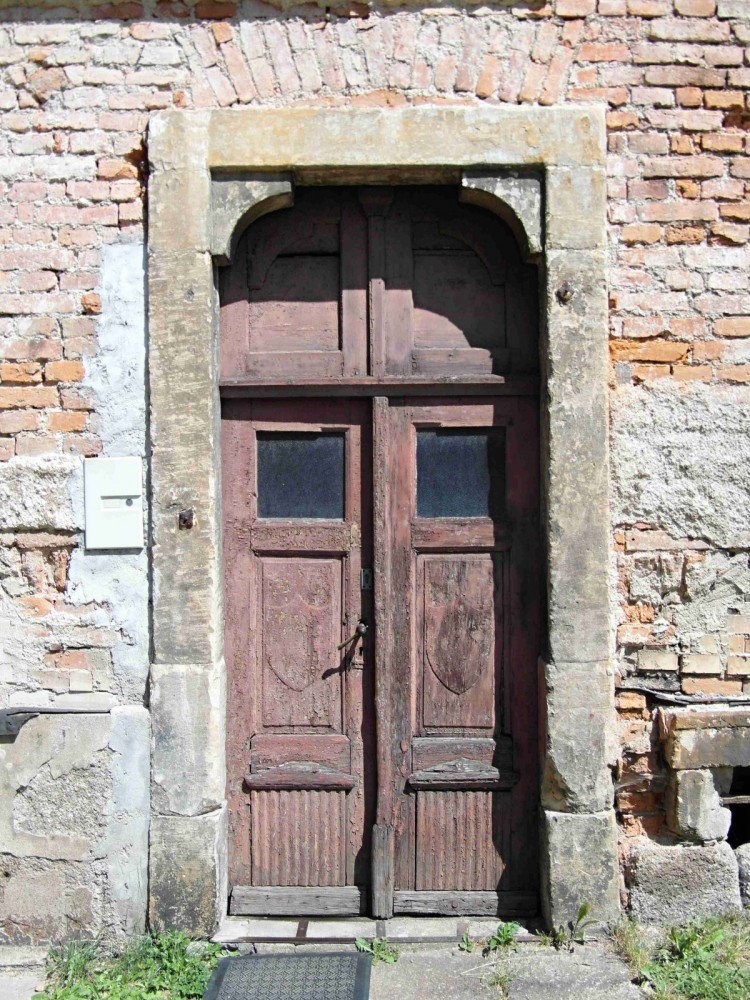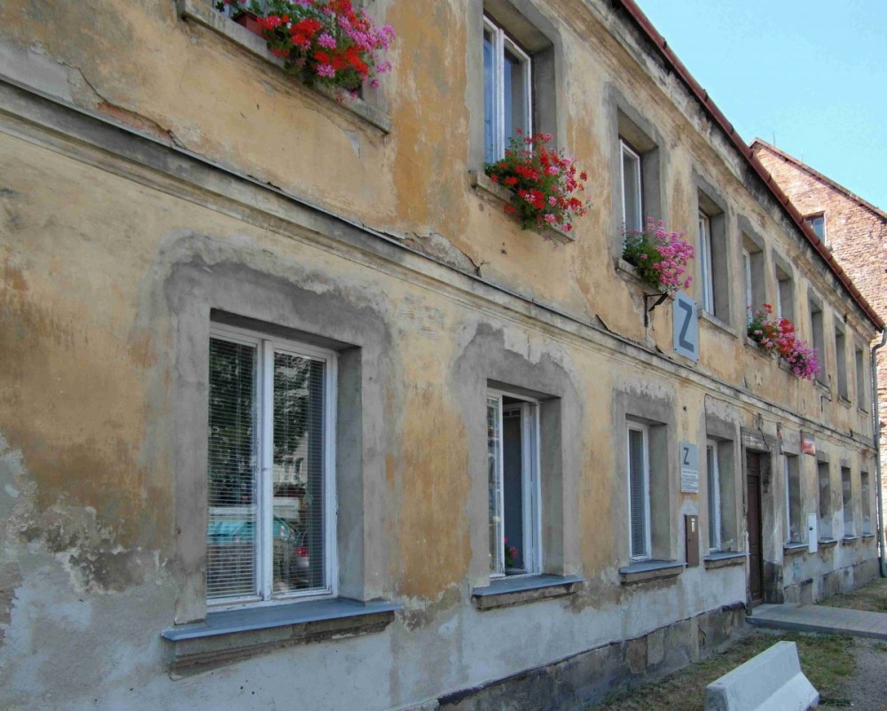 Dům čp. 13, vstupní průčelí členěné kordonovou a korunní římsou, z původního rámování oken zbyly profilované kamenné podokenní římsy.