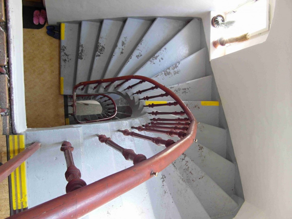 Vřetenové schodiště skládané z kamenných stupňů doplněné litinovým zábradlím pochází z doby rozšíření domu v 70. letech 19. století.