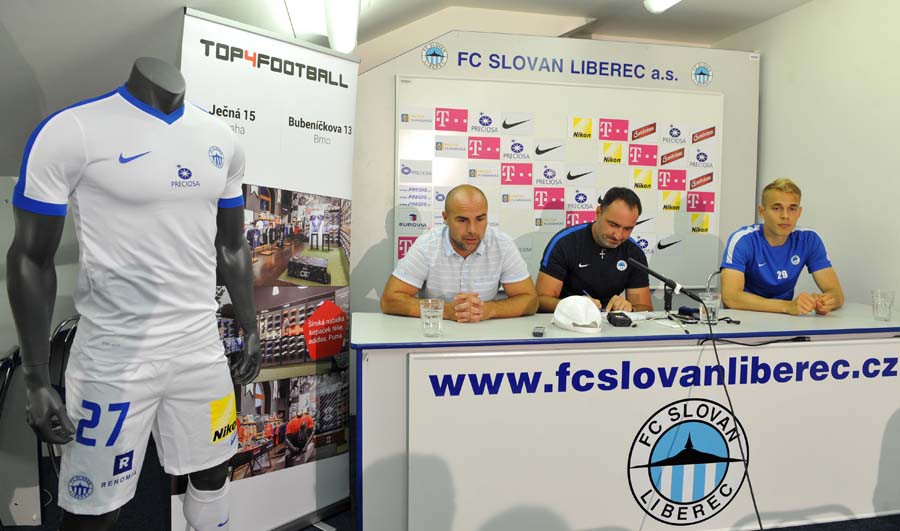 Tisková konference před novou sezonou (vlevo nový dres pro venkovní utkání)