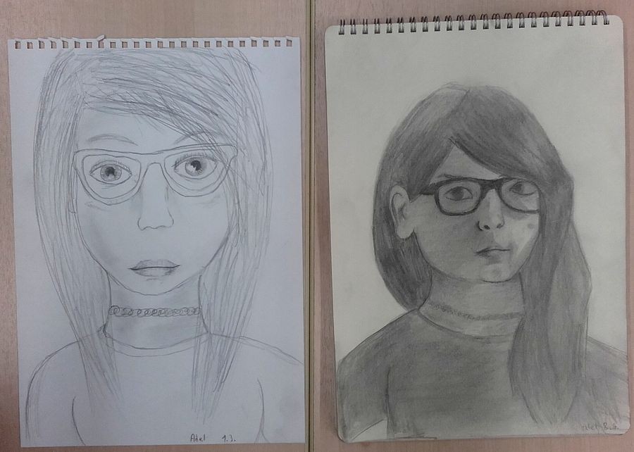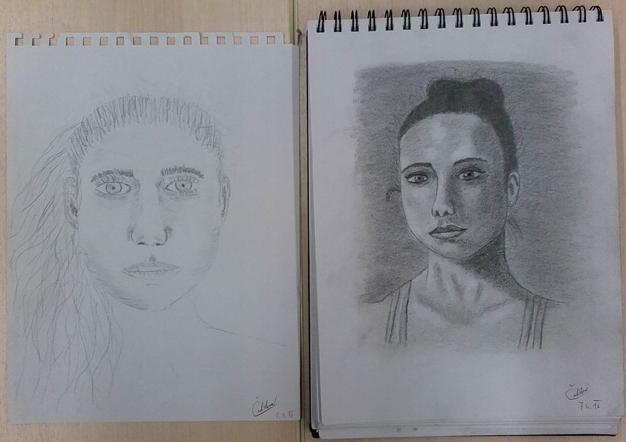 Srovnávací fotografie z kurzů realistické kresby - vlevo na začátku, vpravo po kurzu.