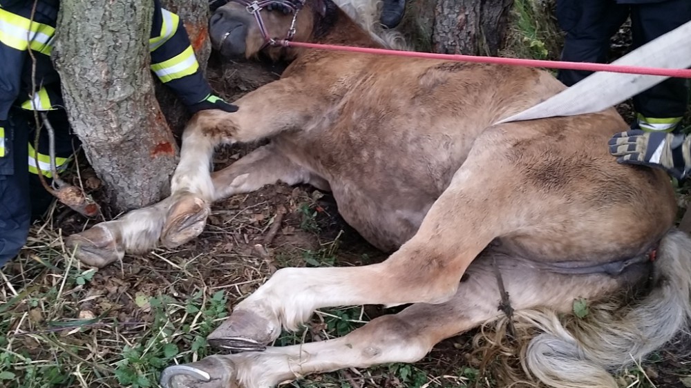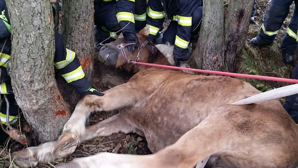 Hasiči vyprošťovali koně ležícího mezi kmeny stromů