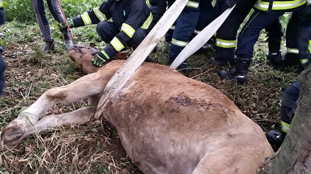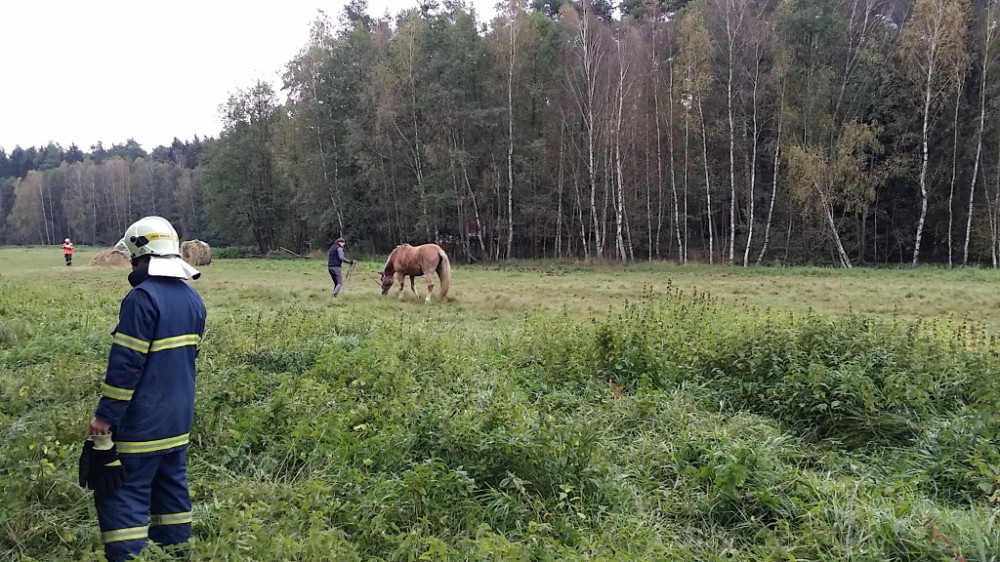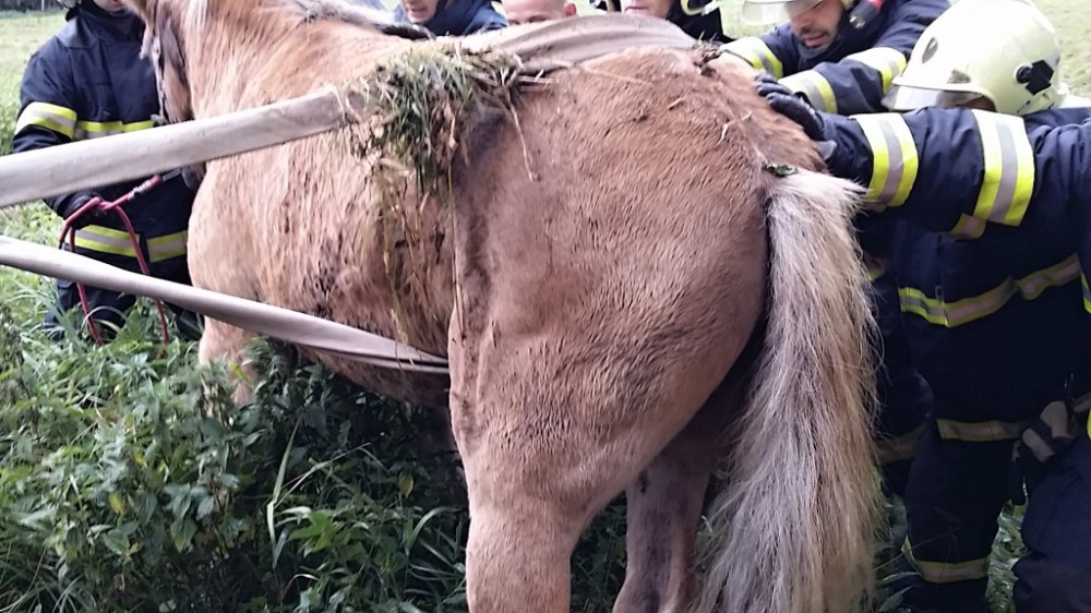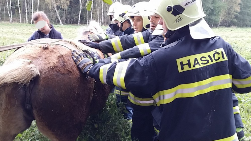FOTO: Hasiči vyprošťovali koně ležícího mezi kmeny stromů