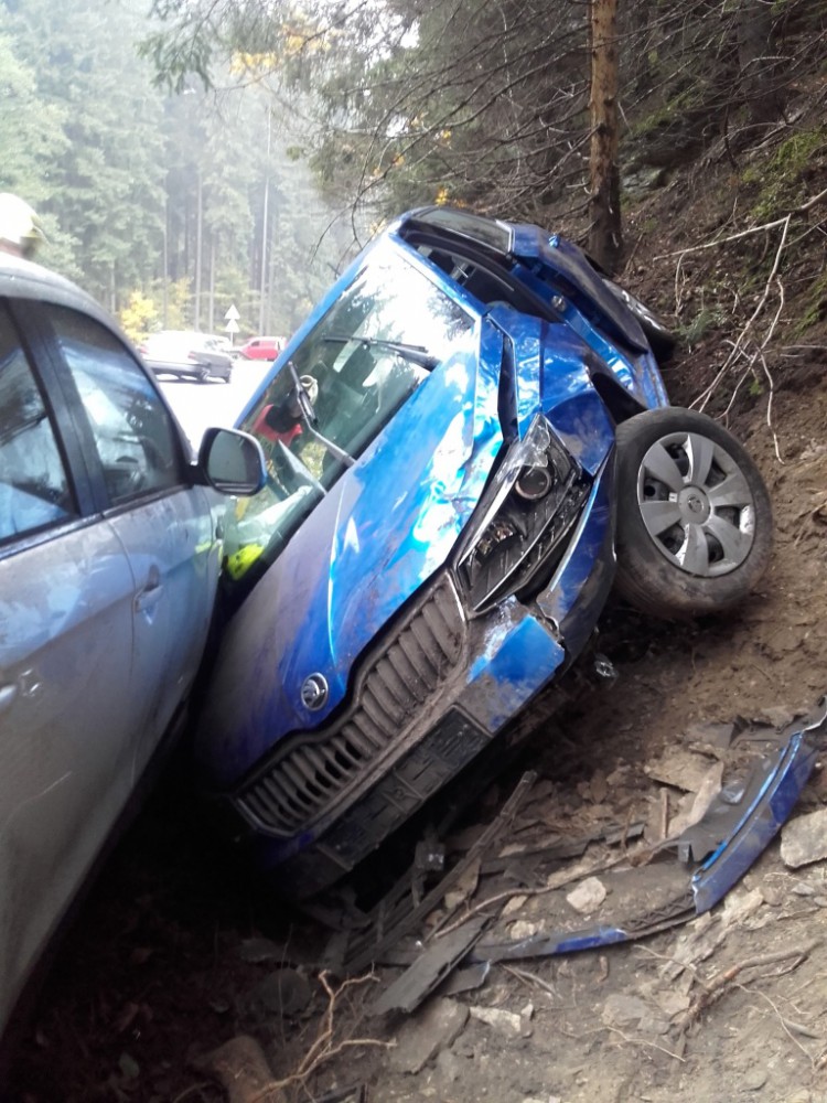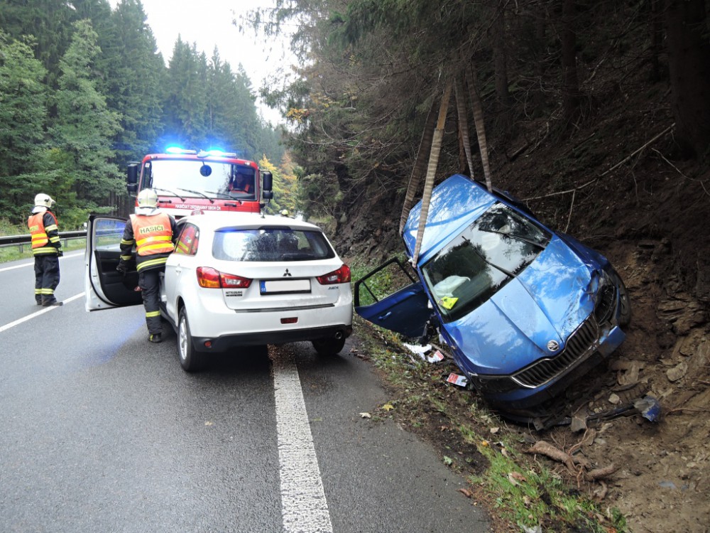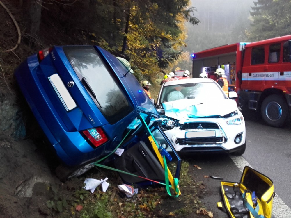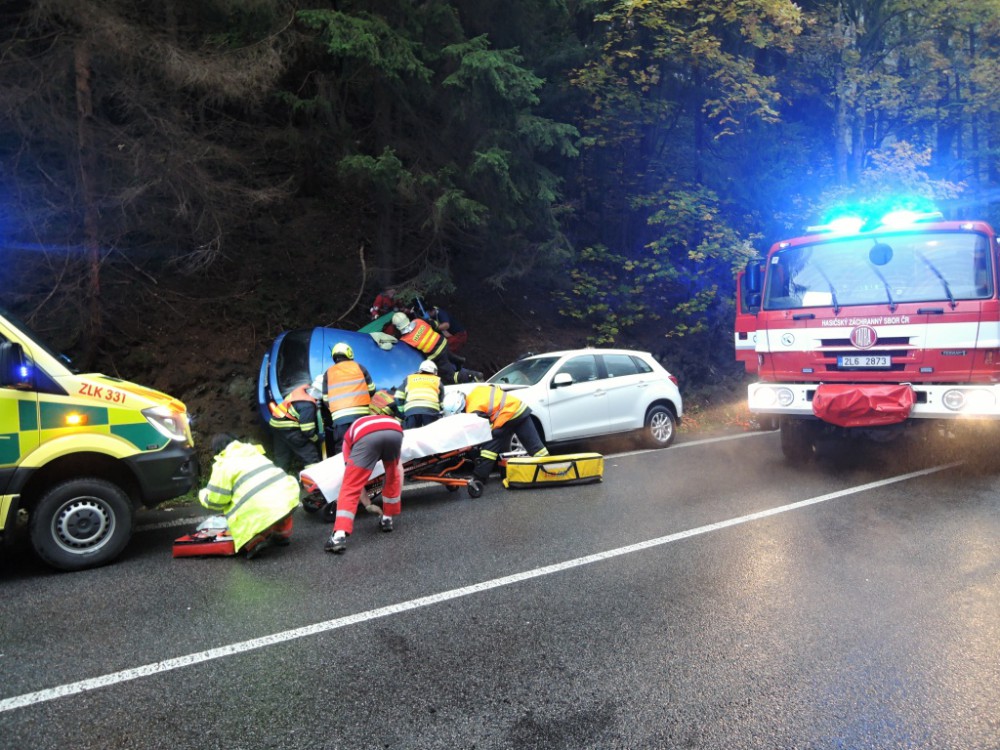 Po srážce dvou aut zůstal zraněný řidič fabie zaklíněný uvnitř vozu