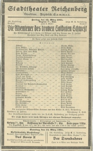 Novinový plakát k představení Dobrého vojáka Švejka z roku 1931.