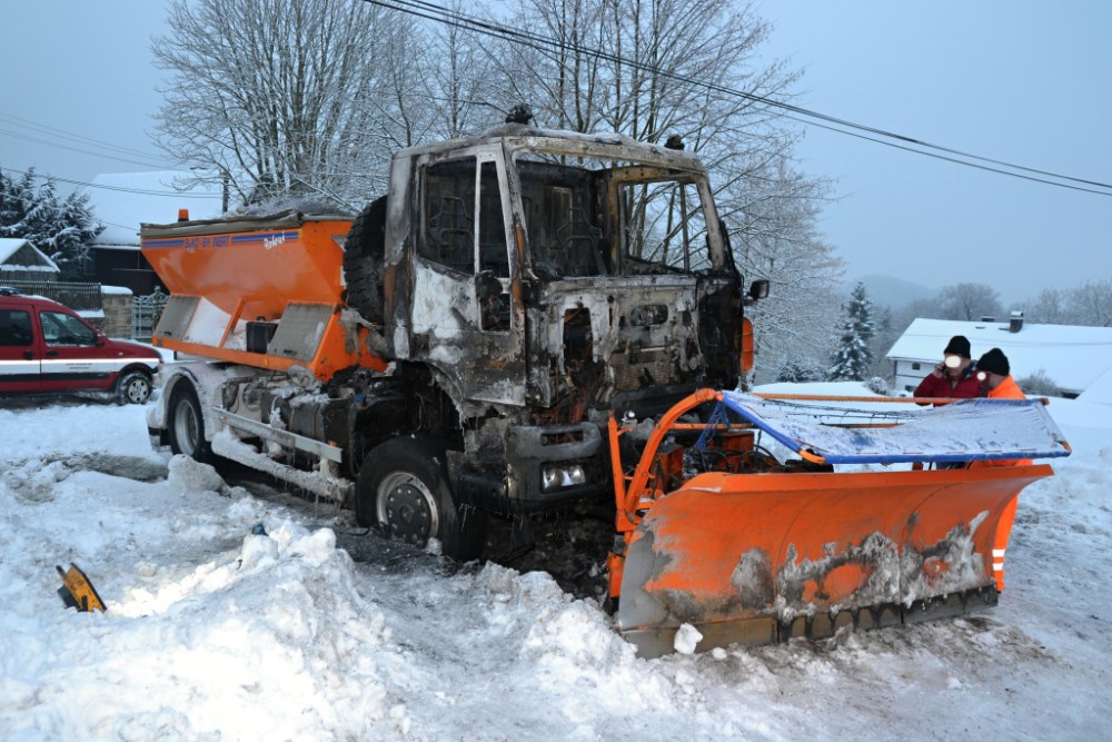 Sypač začal za jízdy hořet. Řidič se snažil oheň uhasit sněhem