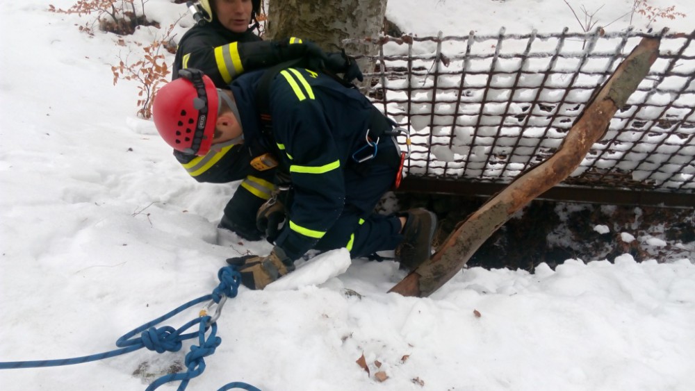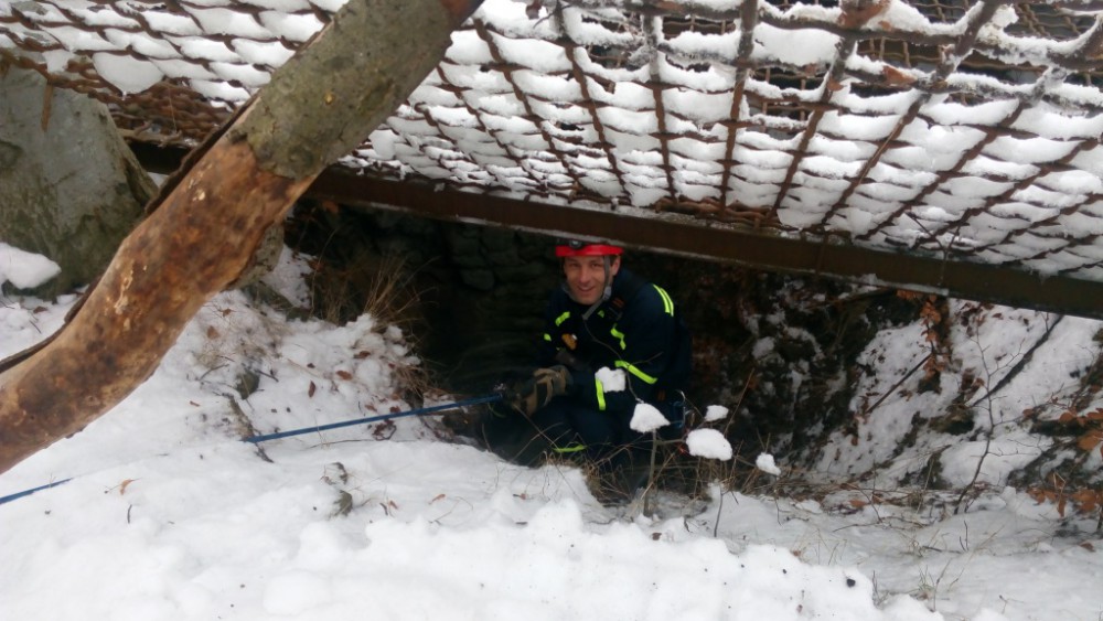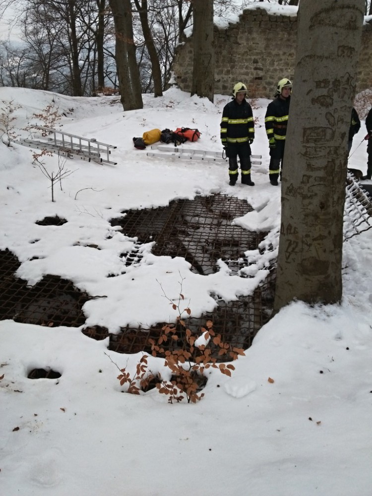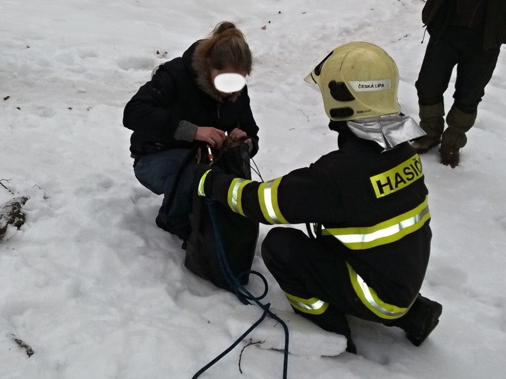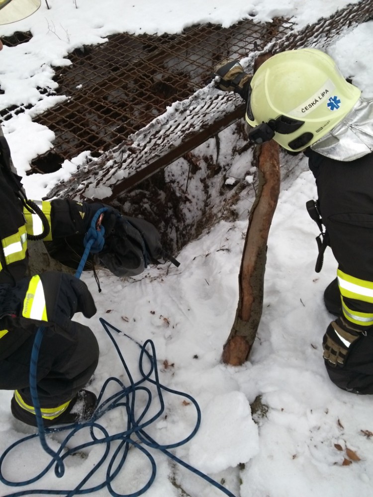 FOTO: Štěně spadlo do osm metrů hluboké štoly. Ven mu pomohli hasiči